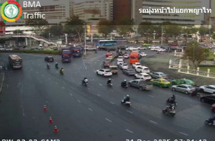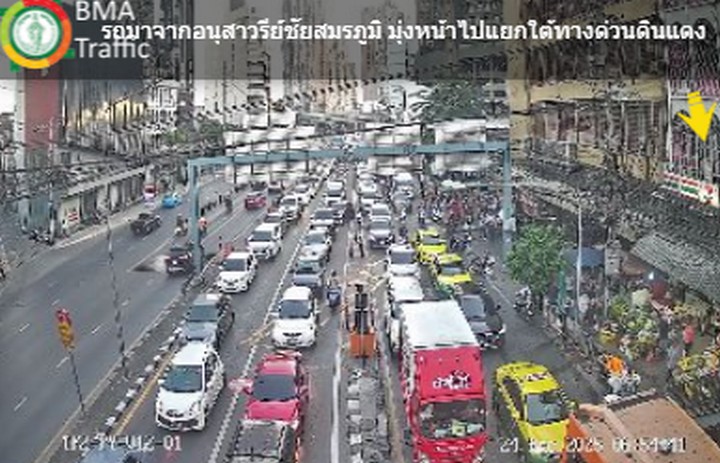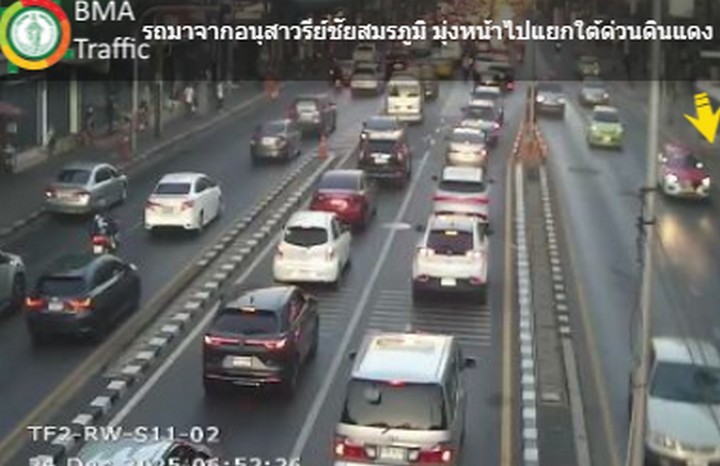 06.55 น. ถนนดินแดง จากใต้ด่วนดินแดง - ถนนราชวิถี เข้าอนุสาวรีย์ชัยสมรภูมิ รถมาก ติดชะลอตัวเบี่ยงงานก่อสร้างสกายวอล์ค ปิด 1 ช่องทางซ้าย บริเวณหน้ารพ.ราชวิถี
