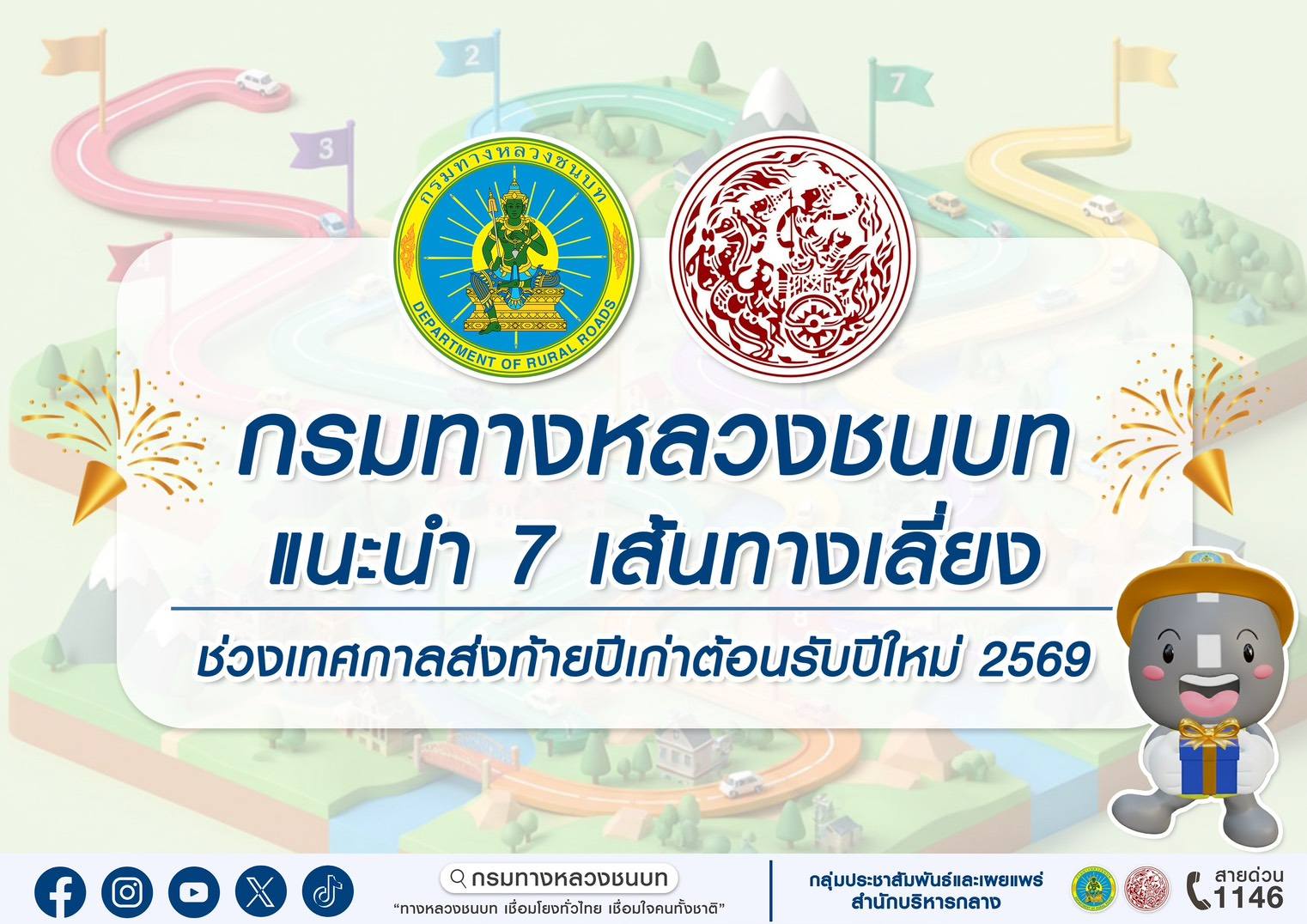 กรมทางหลวงชนบท แนะนำ 7 เส้นทางเลี่ยงช่วงเทศกาลส่งท้ายปีเก่าต้อนรับปีใหม่ 2569 เพื่อบรรเทาการจราจรบนถนนสายหลัก พร้อมอำนวยความสะดวกในการเดินทางให้ประชาชน ถึงที่หมายได้อย่างสะดวกรวดเร็วและปลอดภัย