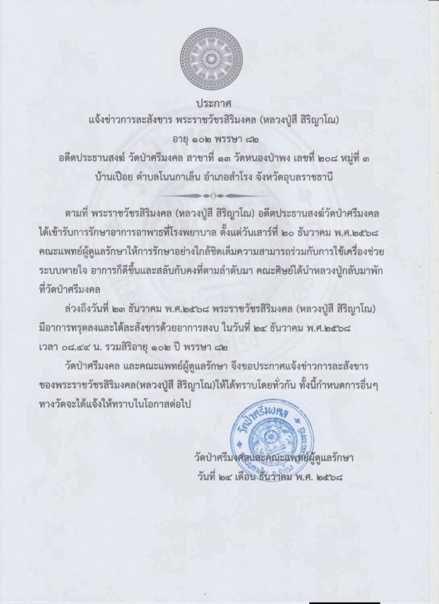 วัดป่าศรีมงคล และคณะแพทย์ผู้ดูแลรักษา จึงขอประกาศแจ้งข่าวการละสังขารของพระราชวัชรสิริมงคล (หลวงปู่สี สิริญาโณ) ให้ได้ทราบโดยทั่วกัน ทั้งนี้กำหนดการอื่นๆ ทางวัดจะได้แจ้งให้ทราบในโอกาสต่อไป 24 ธันวาคม 2568