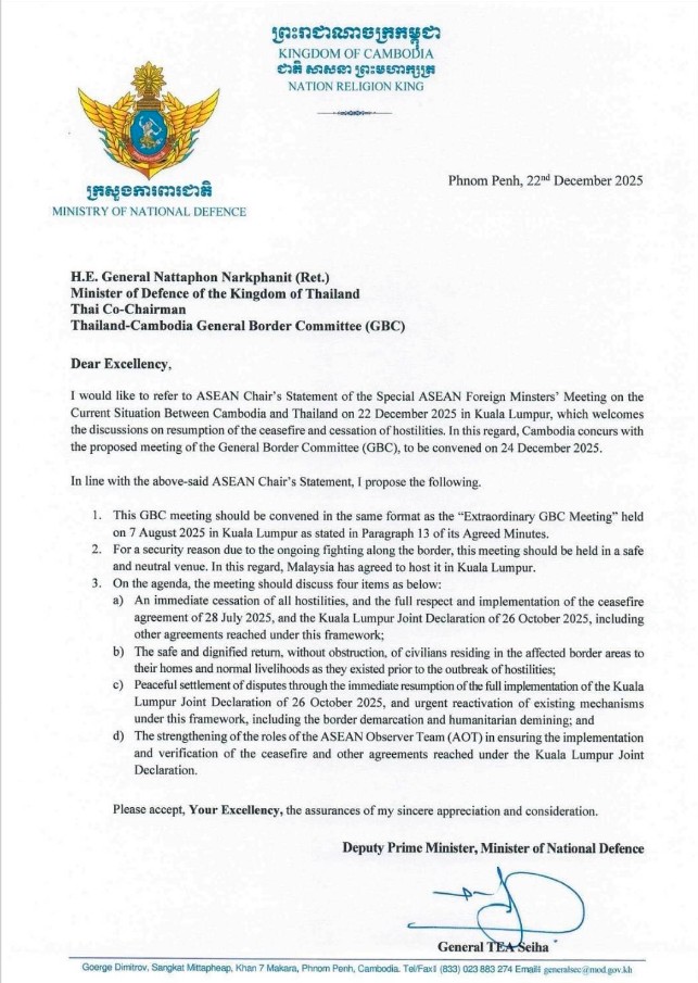 เมื่อวันที่ 22 ธ.ค. 68 กระทรวงกลาโหมกัมพูชา ได้มีหนังสืออย่างเป็นทางการถึงรัฐมนตรีว่าการกระทรวงกลาโหมของไทย เพื่อแสดงความประสงค์ในการเจรจาหยุดยิง ซึ่งถือเป็นก้าวสำคัญภายใต้กรอบเงื่อนไขที่ไทยกำหนด