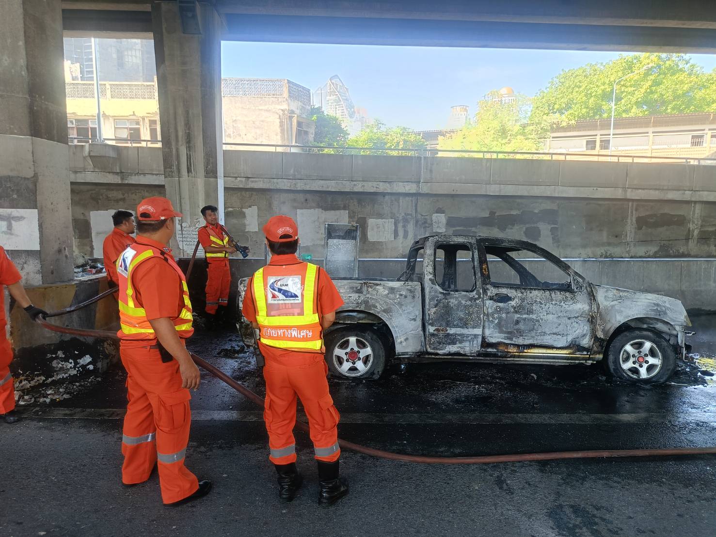 เวลา 09.46 น. เจ้าหน้าที่สถานีดับเพลิง , กู้ภัยพญาไท และเจ้าหน้าที่กู้ภัยทางพิเศษ ถึงที่เกิดเหตุ ขณะนี้เพลิงสงบ เบื้องต้นเป็นรถยนต์กระบะ รายละเอียดเพิ่มเติมอยู่ระหว่างการตรวจสอบ
