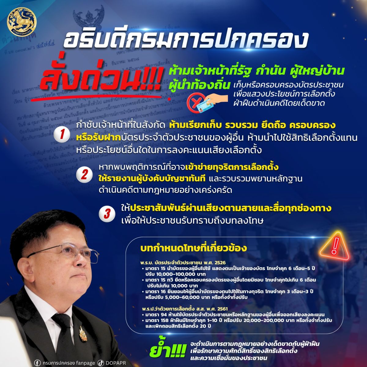 อธิบดีกรมการปกครองย้ำว่า จะดำเนินการตามกฎหมายอย่างเด็ดขาดกับผู้ฝ่าฝืน เพื่อรักษาความศักดิ์สิทธิ์ของสิทธิเลือกตั้งและความเชื่อมั่นของประชาชนต่อระบอบประชาธิปไตย สร้างความเชื่อมั่นต่อกระบวนการเลือกตั้งให้เป็นไปโดยสุจริต ยุติธรรมและโปร่งใส