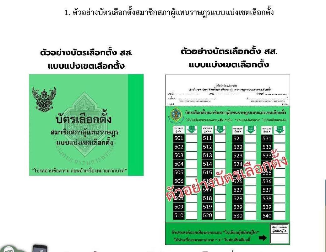 1. ตัวอย่างบัตรเลือกตั้งสมาชิกสภาผู้แทนราษฎรแบบแบ่งเขตเลือกตั้ง เป็นบัตร "สีเขียว"