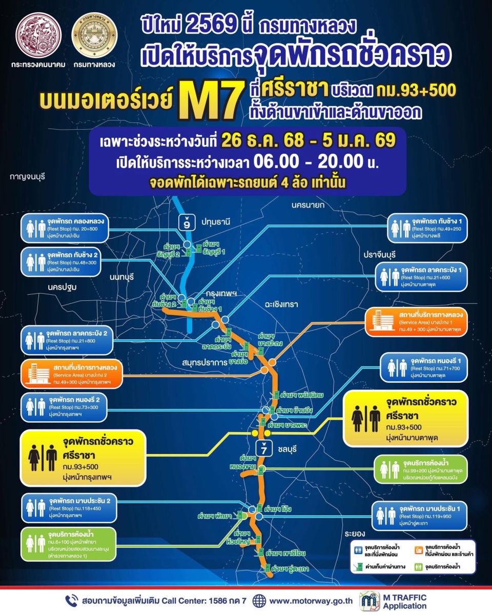 โดยในช่วงปีใหม่ 2569 มอเตอร์เวย์จะเปิดให้บริการเพิ่มเติม “จุดพักรถชั่วคราวศรีราชา” บนมอเตอร์เวย์ M7 บริเวณ กม.93+500 ทั้งฝั่งขาเข้าและฝั่งขาออก