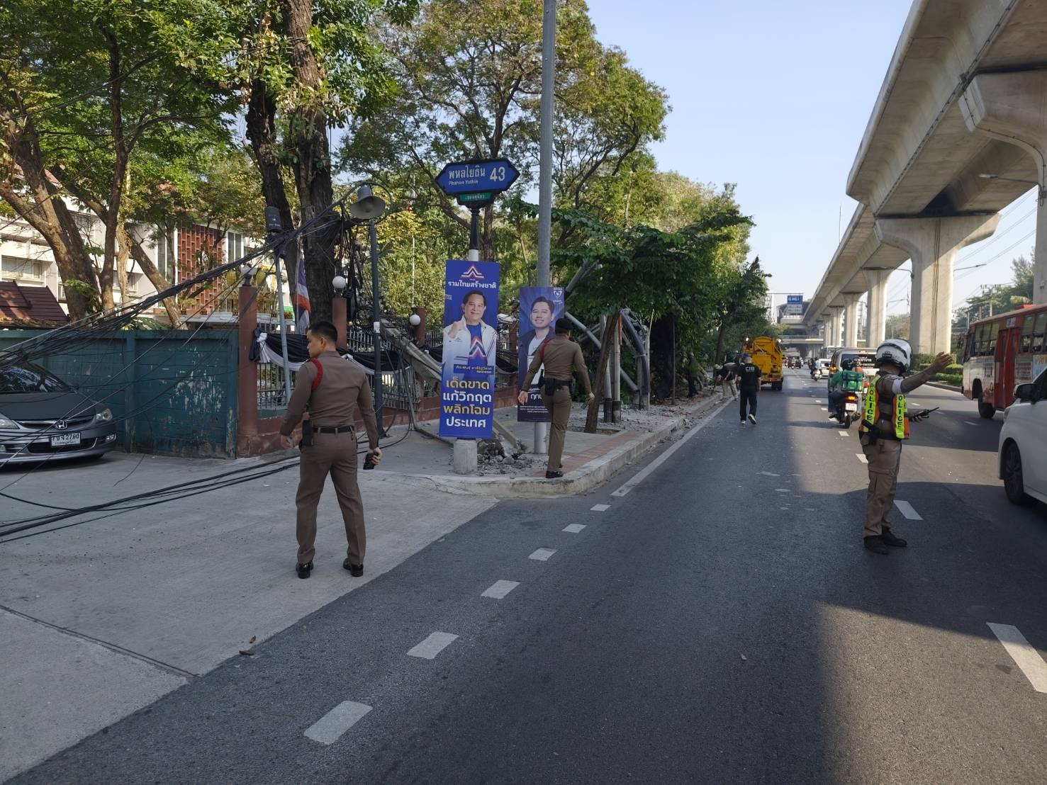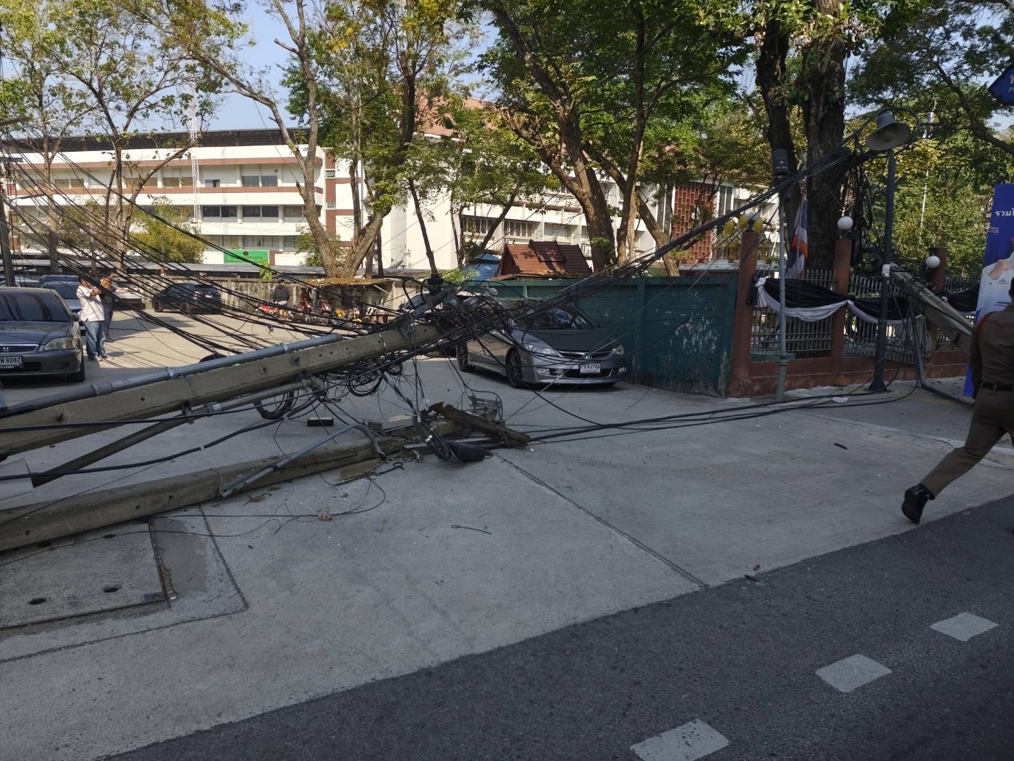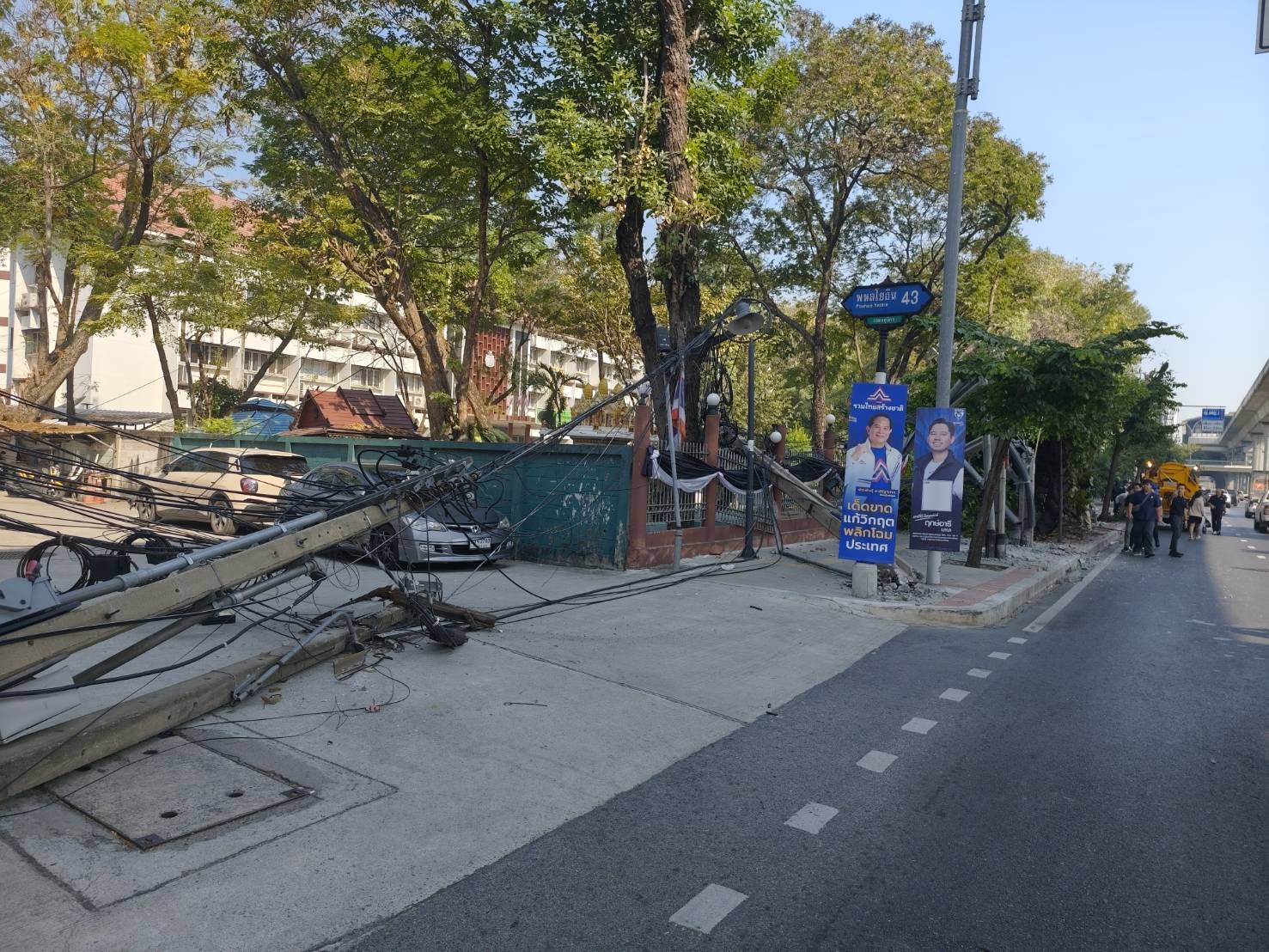 10.27 น. รถโม่ปูนกำลังจะเลี้ยวเข้ากรมป่าไม้ ไปเกี่ยวสายสื่อสารทำให้เสาไฟฟ้าหักหลายต้น ขณะนี้เจ้าหน้าที่การไฟฟ้ากำลังเร่งดำเนินการ รถเริ่มติดขัดแล้ว #รายงานจราจร #รถติด #อุบัติเหตุ #FM91