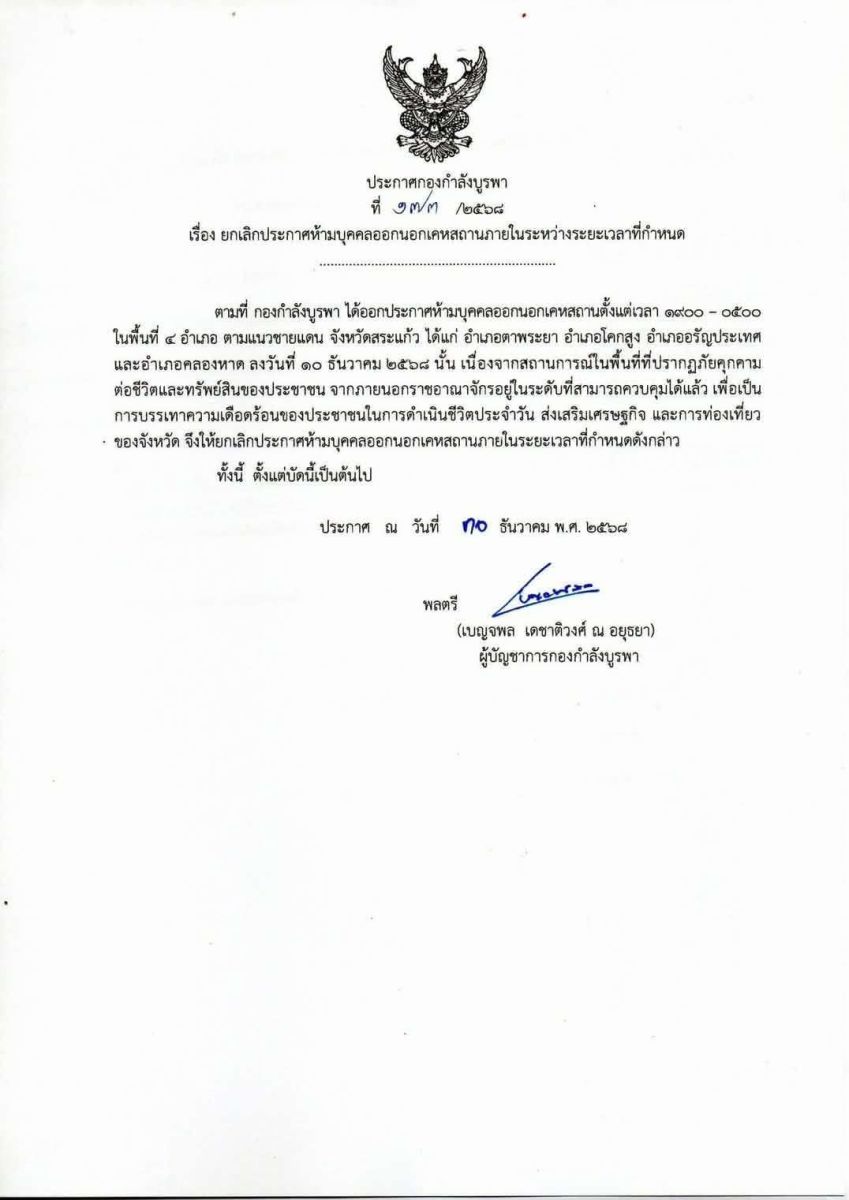 ประกาศด่วน: ยกเลิกเคอร์ฟิว 4 อำเภอชายแดน จ.สระแก้ว! กองกำลังบูรพาได้ออกประกาศ ยกเลิกคำสั่งห้ามบุคคลออกนอกเคหสถาน (เคอร์ฟิว) ในช่วงเวลา 19.00 - 05.00 น. เรียบร้อยแล้ว โดยมีรายละเอียดดังนี้ครับ
