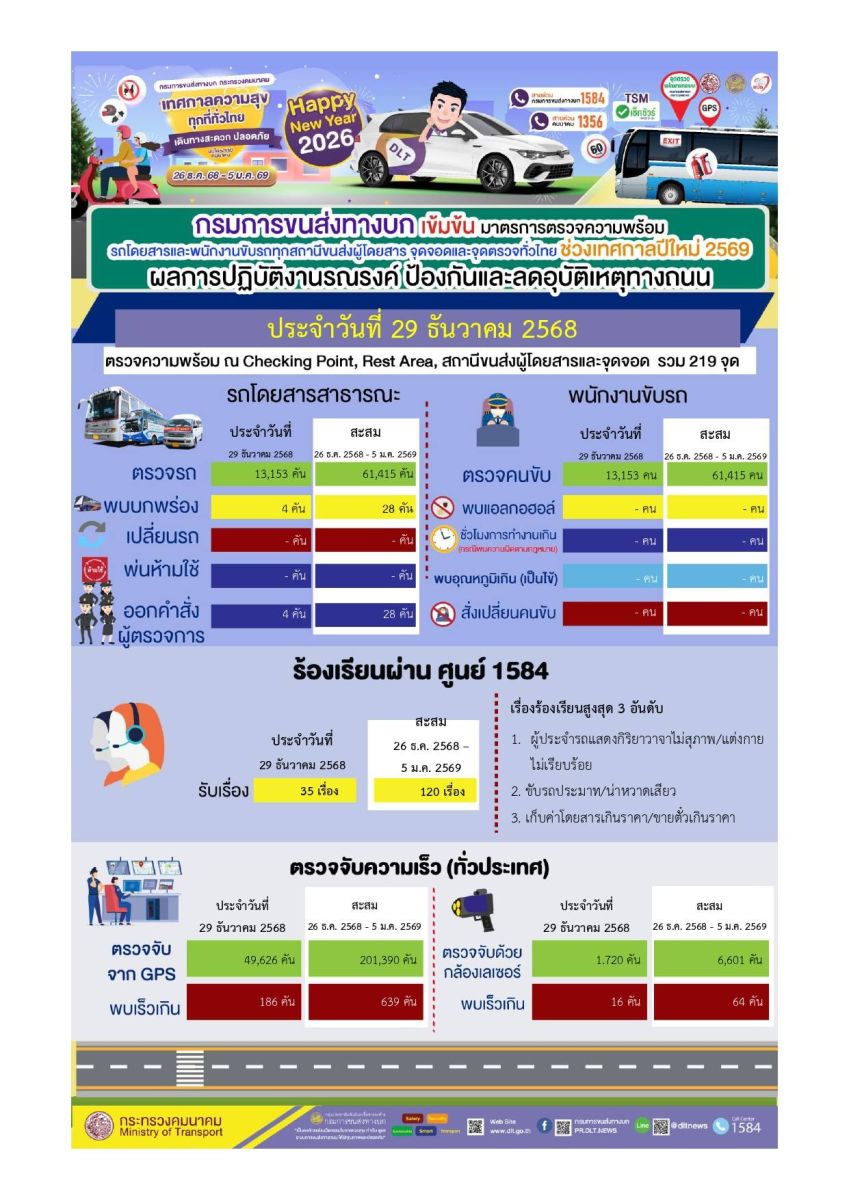 นายสรพงศ์ ไพฑูรย์พงษ์ อธิบดีกรมการขนส่งทางบก เปิดเผยว่า กรมการขนส่งทางบก ได้ดำเนินการตามมาตรการอำนวยความสะดวกและปลอดภัย ช่วงเทศกาลปีใหม่ 2569 โดยมีมาตรการตรวจความพร้อมรถโดยสารสาธารณะและพนักงานขับรถ ณ สถานีขนส่งผู้โดยสารและจุดจอดรถจำนวน 176 แห่ง จุด Checking Point 28 แห่ง และจุด Rest Area 15 แห่ง รวมทั้งสิ้น 219 แห่ง ทั่วประเทศ ระหว่างวันที่ 26 ธ.ค. 2568 – 5 ม.ค. 2569 เพื่อป้องกันและลดอุบัติเหตุทางถนนตลอดช่วงเทศกาลปีใหม่ โดยคาดว่าเทศกาลปีใหม่ในปีนี้จะมีประชาชนเดินทางกลับภูมิลำเนาหรือเดินทางท่องเที่ยวตามสถานที่ต่างๆ และเน้นย้ำให้ผู้ประกอบการขนส่ง ผู้ให้บริการสถานีขนส่งผู้โดยสารและจุดจอดทุกแห่ง ตรวจความพร้อมของรถและความพร้อมของผู้ขับรถก่อนออกเดินทาง ตามแบบ Checklist เช่น การมีใบอนุญาตขับรถที่ถูกต้อง ตามประเภทใบอนุญาตขับรถและไม่หมดอายุ ตรวจความพร้อมด้านร่างกาย และการตรวจวัดระดับแอลกอฮอล์ในลมหายใจต้องเป็นศูนย์มิลลิกรัมเปอร์เซ็นต์ ชั่วโมงการขับรถไม่เกินที่กฎหมายกำหนด รถโดยสารสาธารณะทุกคันต้องมีสภาพมั่นคงแข็งแรงทั้งสภาพตัวรถภายนอกและภายใน รวมทั้งอุปกรณ์เพื่อความปลอดภัยต่างๆ ต้องพร้อมใช้งานอยู่เสมอ ตรวจสอบพฤติกรรมการขับรถของพนักงานขับรถ ตลอด 24 ชั่วโมงผ่านระบบ GPS และมีระบบแจ้งเตือนอัตโนมัติ ผ่านแอปพลิเคชัน DLT GPS Notice แจ้งเตือนพนักงานขับรถเพื่อลดพฤติกรรมเสี่ยงที่อาจก่อให้เกิดอุบัติเหตุ พร้อมจัดเจ้าหน้าที่ให้คำแนะนำและให้ความรู้แก่ผู้โดยสารกรณีเกิดเหตุฉุกเฉิน และขอให้ผู้โดยสารทุกที่นั่งคาดเข็มขัดนิรภัยตลอดการเดินทาง เพื่อป้องกันการบาดเจ็บและเสียชีวิตเมื่อรถเกิดอุบัติเหตุ สำหรับผลการดำเนินการตรวจความพร้อม ในวันที่ 29 ธันวาคม 2568 ตรวจรถโดยสารสาธารณะจำนวน 13,153 คัน พบรถบกพร่อง 4 คัน ดำเนินการออกคำสั่งผู้ตรวจการแล้วทุกคัน ส่วนการตรวจความพร้อมพนักงานขับรถจำนวน 13,153 ราย ไม่พบพนักงานขับรถบกพร่อง