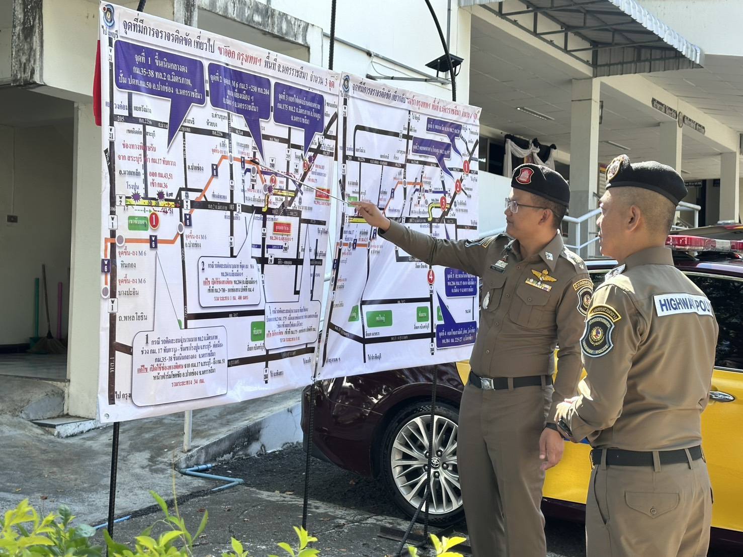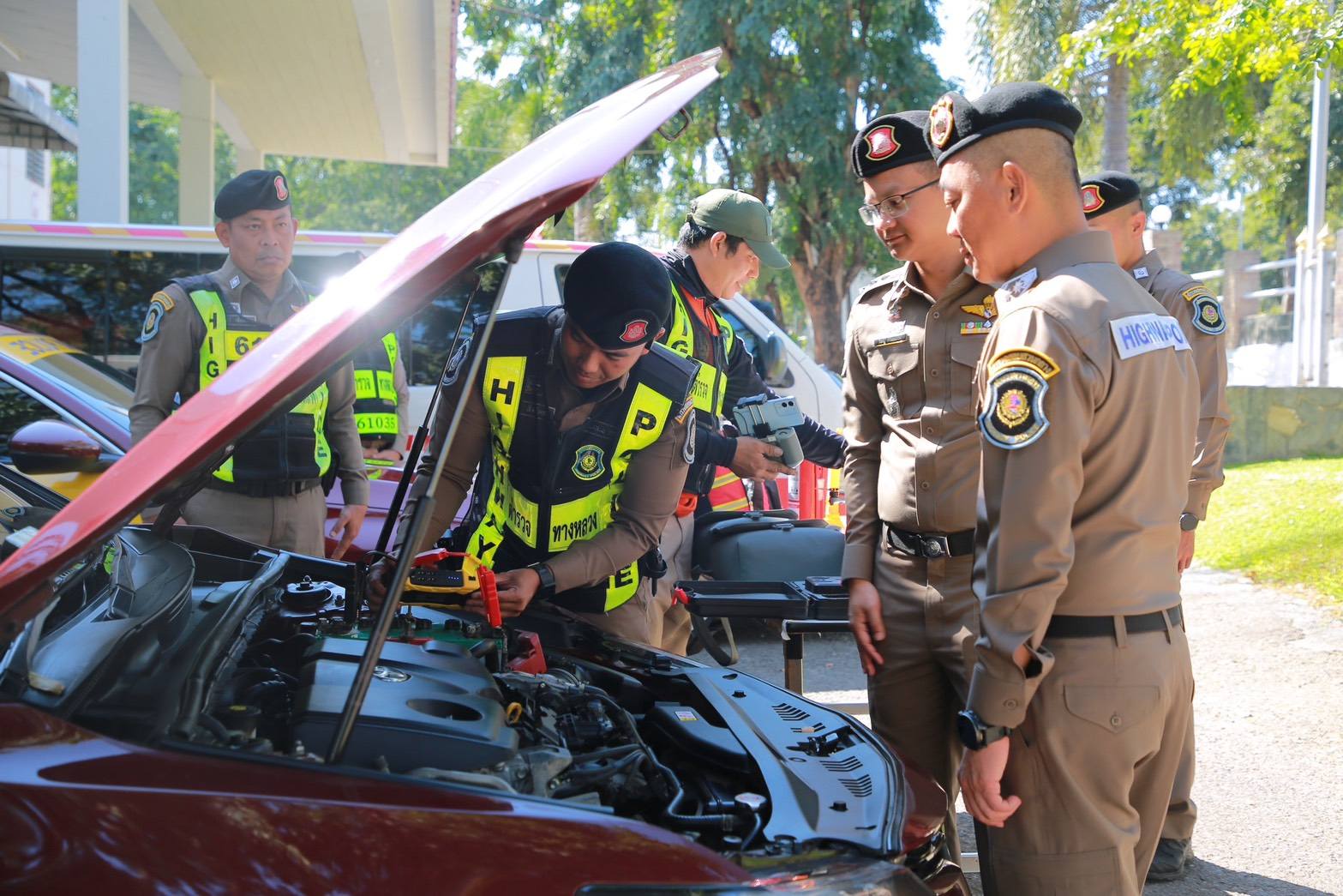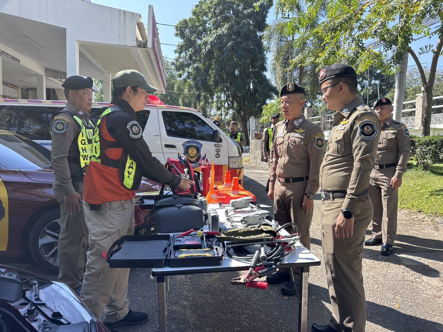 ผู้การทางหลวงได้ตรวจสอบความพร้อมของรถจักรยานยนต์สายตรวจ รถยนต์สายตรวจ อาสาจราจร อุปกรณ์ช่วยเหลือประชาชนบนท้องถนน เช่น อุปกรณ์ปฐมพยาบาล ที่ชาร์ตแบต เติมลม และอื่นๆ เพื่อให้สามารถช่วยเหลือประชาชนบนท้องถนนทุกมิติ