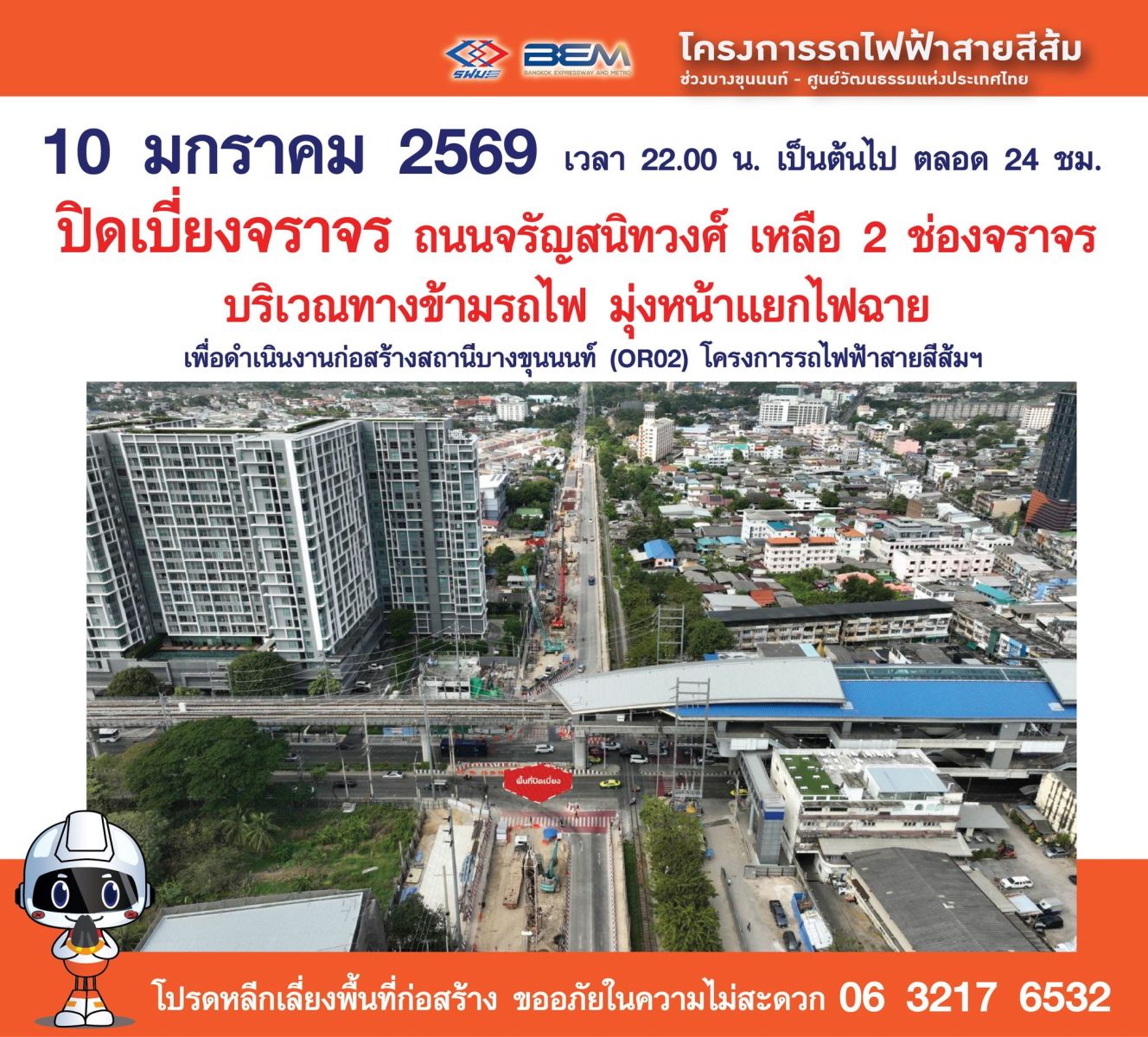 การรถไฟฟ้าขนส่งมวลชนแห่งประเทศไทย (รฟม.) แจ้งว่า บริษัท ช.การช่าง จำกัด (มหาชน) ในฐานะผู้รับจ้างของ บริษัท ทางด่วนและรถไฟฟ้ากรุงเทพ จำกัด (มหาชน) ซึ่งเป็นผู้ร่วมลงทุนโครงการรถไฟฟ้าสายสีส้ม ช่วงบางขุนนนท์ - ศูนย์วัฒนธรรมแห่งประเทศไทย มีแผนจะดำเนินการก่อสร้างสถานีรถไฟฟ้าใต้ดินบางขุนนนท์ (OR02) ซึ่งตั้งอยู่บริเวณถนนจรัญสนิทวงศ์ ตัดกับ ถนนเลียบทางรถไฟตลิ่งชัน และ ถนนสุทธาวาส ซึ่งมีความจำเป็นจะต้องดำเนินการปิดเบี่ยงจราจรบนถนนจรัญสนิทวงศ์ บริเวณทางข้ามทางรถไฟตลิ่งชัน เพื่อดำเนินงานรื้อย้ายสาธารณูปโภค และก่อสร้างกำแพงกันดิน ในวันเสาร์ที่ 10 มกราคม 2569 ตั้งแต่เวลา 22.00 น. จนถึงวันที่ 24 มกราคม 2569 เวลา 24.00 น. ตลอด 24 ชั่วโมง มีผลให้ในบริเวณที่ปิดเบี่ยงผู้ใช้เส้นทางจะสามารถสัญจรได้ 2 ช่องจราจร