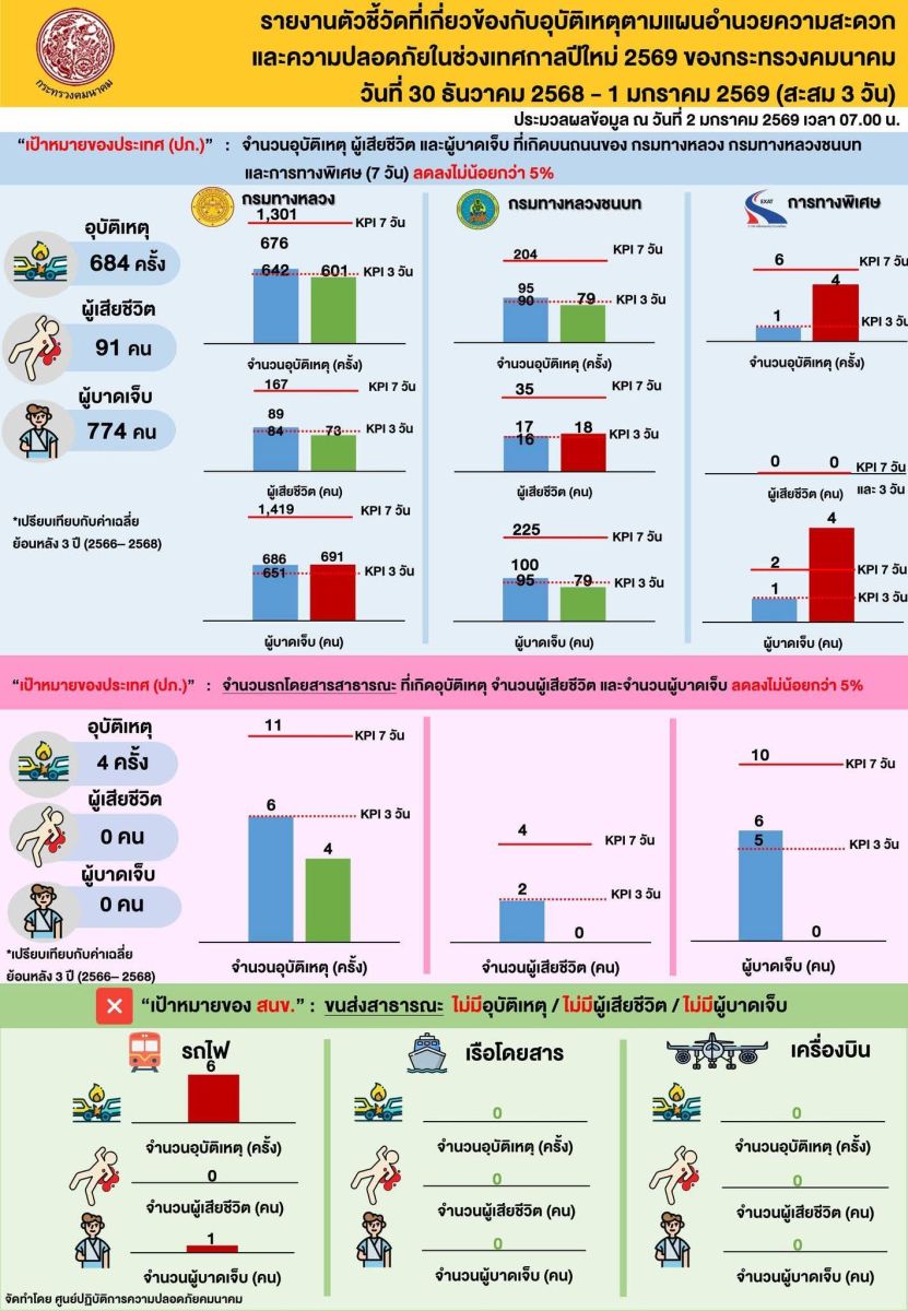 สำหรับภาพรวมอุบัติเหตุบนโครงข่ายของกระทรวงคมนาคม สะสม 3 วัน (วันที่ 30 ธันวาคม 2568 - 1 มกราคม 2569) (ข้อมูล ณ วันที่ 2 มกราคม 2569 เวลา 07.00 น.) พบว่า โครงข่ายทางถนนเกิดอุบัติเหตุรวม 684 ครั้ง มีผู้บาดเจ็บ 774 คน และเสียชีวิต 91 คน สาเหตุหลักมาจากการขับรถเร็วเกินกำหนด 436 ครั้ง คิดเป็นร้อยละ 63 ยานพาหนะที่เกิดเหตุสูงสุดคือรถจักรยานยนต์ 402 คัน คิดเป็นร้อยละ 35 ลักษณะพื้นที่เกิดเหตุส่วนใหญ่เป็นทางตรงไม่มีความลาดชัน จังหวัดที่มีผู้เสียชีวิตสูงสุด คือ กรุงเทพฯ ขอนแก่น และนครราชสีมา จำนวน 5 คน ขณะที่จังหวัดที่เกิดอุบัติเหตุสูงสุดคือ สุพรรณบุรี 33 ครั้ง ทั้งนี้ เมื่อเปรียบเทียบกับช่วงเดียวกันของปีที่ผ่านมา (วันที่ 27 - 29 ธันวาคม 2567) พบว่า อุบัติเหตุลดลงร้อยละ 15 ผู้เสียชีวิตลดลงร้อยละ 19 และผู้บาดเจ็บลดลงร้อยละ 7 ส่วนโครงข่ายทางรางเกิดอุบัติเหตุรวม 6 ครั้ง มีผู้บาดเจ็บ 1 คน ขณะที่โครงข่ายทางน้ำและทางอากาศไม่มีรายงานอุบัติเหตุ