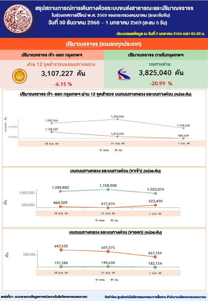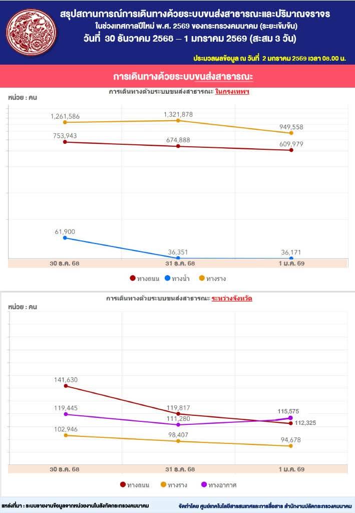 ศูนย์ปฏิบัติการความปลอดภัยคมนาคม (ศปภ.คค.) กระทรวงคมนาคม สรุปข้อมูลการเดินทางบนโครงข่ายคมนาคม สะสม 3 วัน (วันที่ 30 ธันวาคม 2568 - 1 มกราคม 2569) (ข้อมูล ณ วันที่ 2 มกราคม 2569 เวลา 08.00 น.) พบว่า ระบบขนส่งสาธารณะสามารถรองรับการเดินทางของประชาชนได้อย่างเพียงพอ มีการเดินทางด้วยระบบขนส่งสาธารณะรวม 8,267,576 คน ลดลงร้อยละ 3.88 เปรียบเทียบกับวันที่ 27 - 28 ธันวาคม 2567 แบ่งเป็นการเดินทางด้วยระบบขนส่งสาธารณะภายในประเทศ 7,458,167 คน โดยระบบรางมีสัดส่วนการใช้บริการสูงสุด คิดเป็นร้อยละ 45 ขณะที่ผู้ใช้บริการสูงสุดในแต่ละภูมิภาค ได้แก่ ภาคกลาง (ทางอากาศขาออก) 162,994 คน ภาคใต้ (ทางราง) 102,504 คน ภาคตะวันออกเฉียงเหนือ (ทางถนน) 84,557 คน ภาคเหนือ (ทางราง) 54,203 คน และภาคตะวันออก (ทางถนน) 59,570 คน ส่วนการเดินทางด้วยระบบขนส่งสาธารณะระหว่างประเทศมีจำนวนรวม 809,409 คน ลดลงร้อยละ 4.6 สำหรับการจราจรเข้า - ออกกรุงเทพฯ บนทางหลวงสายหลัก 12 เส้นทาง มีปริมาณ 3,107,227 คัน ลดลงร้อยละ 6.15 และการเดินทางภายในกรุงเทพฯ บนทางด่วนของการทางพิเศษแห่งประเทศไทย มีปริมาณ 3,825,040 คัน ลดลงร้อยละ 20.99