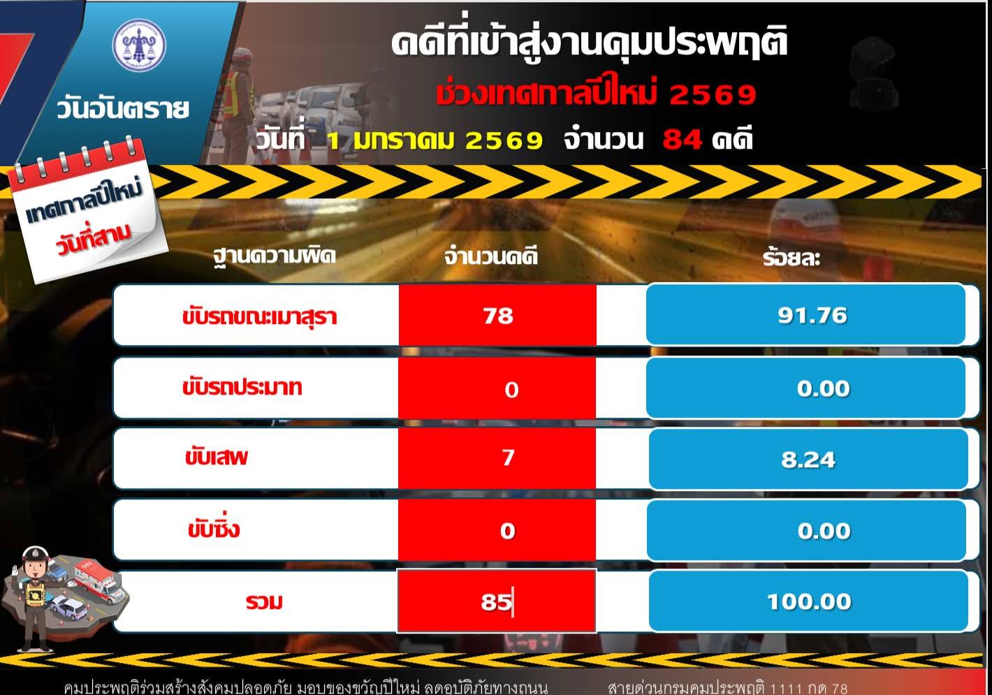 ขณะที่ยอดคดีสะสมตลอด 3 วัน (30 ธันวาคม 2568 – 1 มกราคม 2569) รวมทั้งสิ้น 1,558 คดี แบ่งเป็น