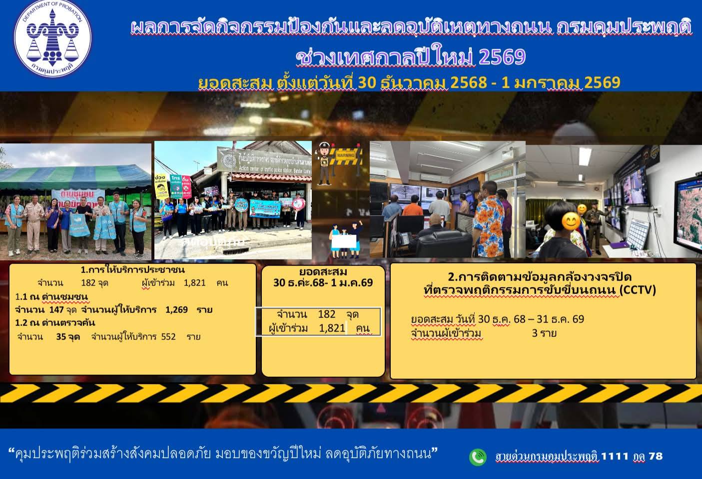 อธิบดีกรมคุมประพฤติ ย้ำมาตรการช่วงควบคุมเข้มข้น ให้สำนักงานคุมประพฤติทั่วประเทศบูรณาการจัดกิจกรรมร่วมกับหน่วยงานที่เกี่ยวข้องและอาสาสมัครคุมประพฤติในพื้นที่ นำผู้ถูกคุมความประพฤติทำงานบริการสังคม ณ หน่วยบริการประชาชน ทั้งในจุดตรวจหลักและด่านชุมชน รวมถึงการทำความสะอาดและปรับภูมิทัศน์บริเวณจุดเสี่ยง จำนวน 28 จุด โดยมีผู้เข้าร่วมกิจกรรมทั้งสิ้น จำนวน 310 ราย เพื่อเป็นการรณรงค์ป้องกันและลดอุบัติเหตุทางถนน