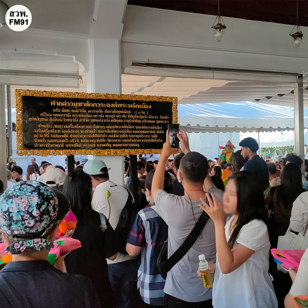 โดยบริเวณบริเวณศาลหลักเมืองกรุงเทพพบว่า ประชาชนถือพานเครื่องสักการะ พวงมาลัย ดอกไม้ ธูปเทียน น้ำมัน ผ้าสามสี และเครื่องบูชา เพื่อเตรียมถวายสิ่งศักดิ์สิทธิ์ศาลหลักเมืองกรุงเทพมหานคร บรรยากาศค่อนข้างหนาแน่น ทำให้การสัญจรไปยังจุดต่าง ๆ ภายในศาลมีความติดขัดบ้างเป็นบางช่วง มีเจ้าหน้าที่เทศกิจคอยอำนวยความสะดวกและจัดระเบียบให้พี่น้องประชาชนอย่างต่อเนื่อง