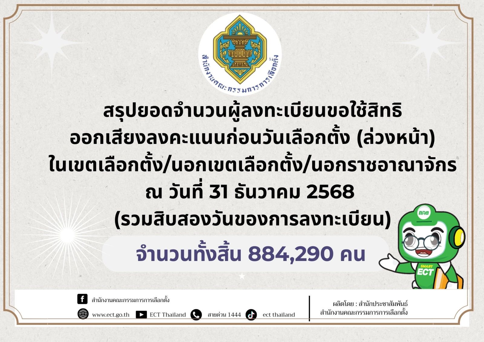 รองโฆษก ระบุว่า ณ ปัจจุบัน การลงทะเบียนขอใช้สิทธิเลือกตั้งล่วงหน้า ได้เปิดให้ผู้มีสิทธิเลือกตั้งดำเนินการแล้ว ตั้งแต่วันที่ 20 ธันวาคม 2568 และจะสิ้นสุดในวันที่ 5 มกราคม 2569 โดยสามารถลงทะเบียนได้ทั้งในเขตเลือกตั้ง, นอกเขตเลือกตั้ง และ นอกราชอาณาจักร ผ่านหลายช่องทาง โดยเฉพาะระบบออนไลน์ที่สะดวกตลอด 24 ชั่วโมง