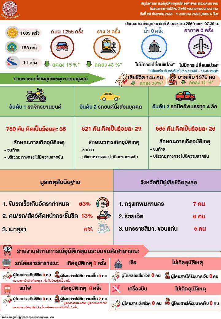 ส่วนสรุปสถิติอุบัติเหตุบนโครงข่ายของกระทรวง ระหว่างวันที่ 30 ธันวาคม 2568 - 4 มกราคม 2569 ณ วันที่ 5 มกราคม 2569 เวลา 07.30 น. ได้แก่ ทางถนน เกิดอุบัติเหตุรวม 1,258 ครั้ง/ ผู้เสียชีวิต 145 คน ผู้บาดเจ็บ 1,180 คน สาเหตุ คือ ขับรถเร็วเกินอัตรากำหนด 787 ครั้ง คิดเป็นร้อยละ 63 ยานพาหนะที่เกิดเหตุสูงสุด คือ รถจักรยานยนต์ 750 คัน คิดเป็นร้อยละ 35 บริเวณที่เกิดเหตุสูงสุด คือ ทางตรง ไม่มีความลาดชัน และจังหวัดที่มีผู้เสียชีวิตสูงสุด คือ กรุงเทพมหานคร (7 คน) จังหวัดที่เกิดเหตุสูงสุด คือ กรุงเทพมหานคร สุพรรณบุรี (59 ครั้ง) โดยสรุปเมื่อเปรียบเทียบกับช่วงเดียวกันปีที่แล้ว จำนวนอุบัติเหตุลดลงร้อยละ 15 จำนวนผู้เสียชีวิตลดลงร้อยละ 30 และจำนวนผู้บาดเจ็บลดลงร้อยละ 15