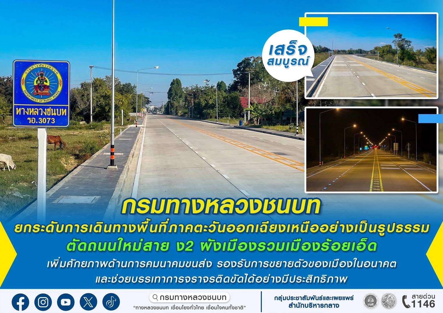 นายพิชิต หุ่นศิริ อธิบดีกรมทางหลวงชนบท เปิดเผยว่า ขณะนี้กรมทางหลวงชนบท (ทช.) ได้ดำเนินโครงการก่อสร้างถนนสาย ง2 ผังเมืองรวมเมืองร้อยเอ็ด จังหวัดร้อยเอ็ด (ถนนทางหลวงชนบทสาย รอ.3073) เสร็จสมบูรณ์ และเปิดให้ประชาชนได้ใช้สัญจรเรียบร้อยแล้ว ซึ่งถนนสายดังกล่าวเป็นการเพิ่มศักยภาพในด้านการคมนาคมขนส่งในพื้นที่จังหวัดร้อยเอ็ดและจังหวัดใกล้เคียง ยกระดับการเดินทางให้มีประสิทธิภาพมากยิ่งขึ้น ตลอดจนเป็นการบรรเทาการจราจรติดขัดในเขตเมือง ลดระยะเวลาในการเดินทาง รองรับการขยายตัวของเมืองในอนาคตได้อย่างเป็นรูปธรรม