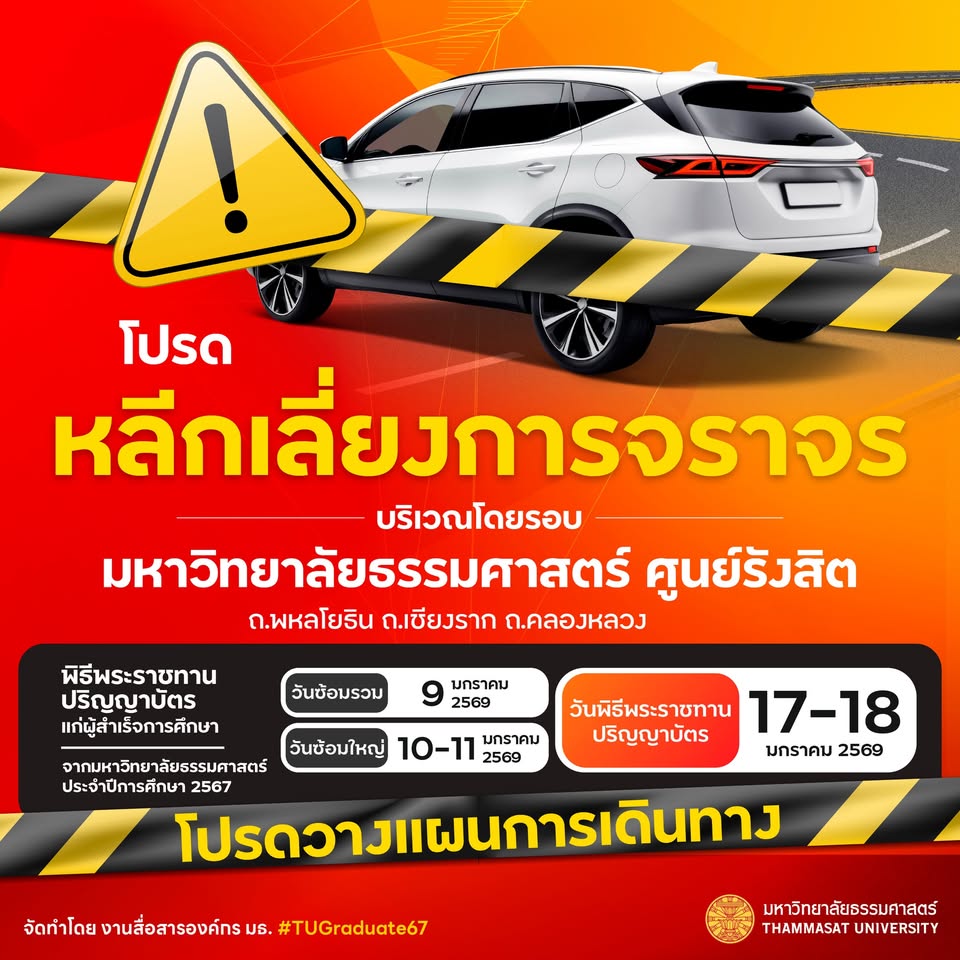 ม.ธรรมศาสตร์ ประกาศแจ้งหลีกเลี่ยงการจราจรในช่วงพิธีพระราชทานปริญญาบัตร เตรียมพร้อมพื้นที่จุดจอดรถ เพื่อความสะดวกของผู้เข้าร่วมงาน ในวันซ้อมใหญ่ 10-11 มกราคม 2569 และวันพิธีพระราชทานปริญญาบัตร วันที่ 17-18 มกราคม 2569