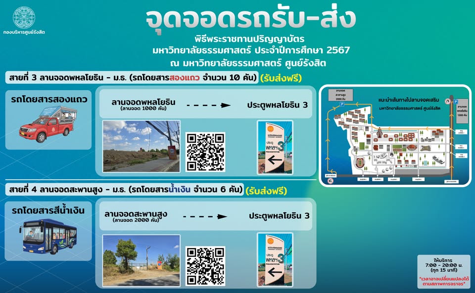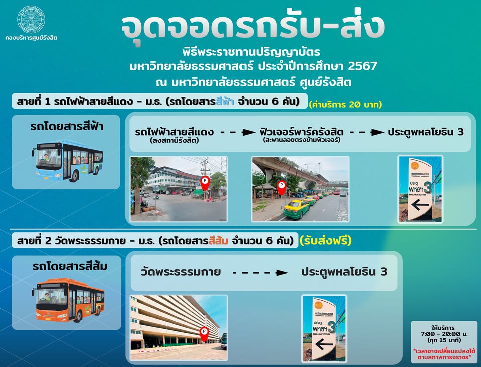 ทั้งนี้ สำหรับผู้ที่ไม่มีบัตรจอดรถ มหาวิทยาลัยได้จัดเตรียมพื้นที่จุดจอดรถบริเวณใกล้เคียงมหาวิทยาลัย จำนวน 3 ลานจอด ได้แก่ ลานจอดรถเสริมสะพานสูง (2,000 คัน) ลานจอดรถฝั่งตรงข้ามมหาวิทยาลัยธรรมศาสตร์ (ลานจอดพหลโยธิน 1,000 คัน) และวัดพระธรรมกาย (10,000 คัน) โดยมหาวิทยาลัยจัดรถบริการรับ-ส่งผู้เข้าร่วมงานฟรี สำหรับผู้เดินทางโดยรถไฟฟ้าสายสีแดงจากสถานีรังสิตมายังมหาวิทยาลัยธรรมศาสตร์ ศูนย์รังสิต สามารถโดยสารรถประจำทางสีฟ้า ค่าบริการ 20 บาท และขอความร่วมมือผู้เข้าร่วมงานปฏิบัติตามคำแนะนำเพื่อให้การจัดงานเป็นไปอย่างราบรื่นและปลอดภัย