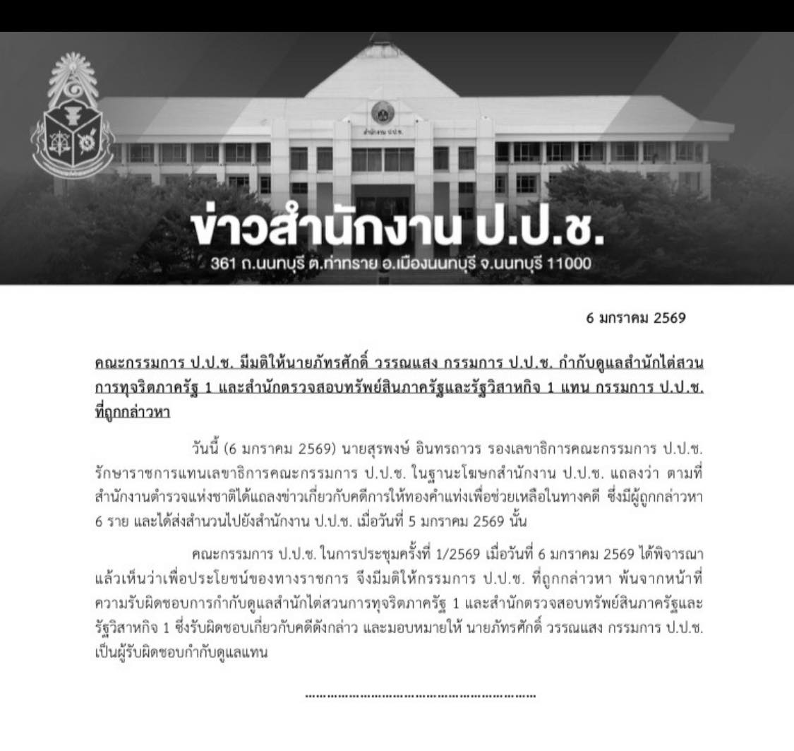 วันที่ 6 มกราคม 2569 นายสุรพงษ์ อินทรถาวร รองเลขาธิการคณะกรรมการป้องกันและปราบปรามการทุจริตแห่งชาติ (ป.ป.ช.) รักษาราชการแทนเลขาธิการคณะกรรมการ ป.ป.ช. ในฐานะโฆษกสำนักงาน ป.ป.ช. แถลงว่า ตามที่สำนักงานตำรวจแห่งชาติได้แถลงข่าวเกี่ยวกับคดีการให้ทองคำแท่งเพื่อช่วยเหลือในทางคดี ซึ่งมีผู้ถูกกล่าวหา 6 ราย และได้ส่งสำนวนไปยังสำนักงาน ป.ป.ช. เมื่อวันที่ 5 มกราคม 2569 นั้น