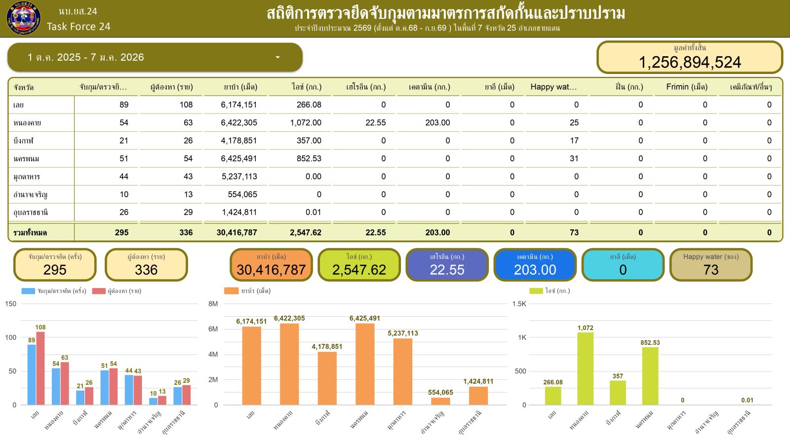 รายงานข่าวเปิดเผยว่า ผลการจับกุมยาเสพติดในพื้นที่ นบ.ยส.24 ระหว่างวันที่ 1 ต.ค.2025 -7 ม.ค.2026 มีผลการจับกุมทั้งสิ้นในพื้นที่จีงหวัดเลย หนองคาย บึงกาฬ นครพนมมุกดาหาร อำนาจเจริญ และอุบลราชธานี จำนวน 295 ครั้ง ได้ผู้ต้องหาจำนวน 336 ราย