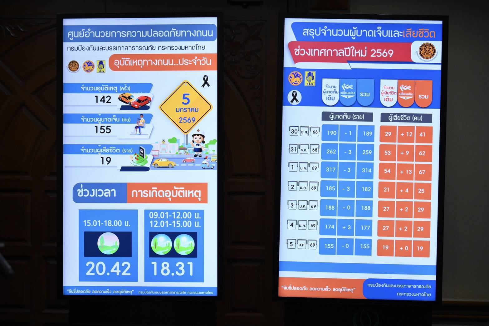 รองปลัดกระทรวงมหาดไทย กล่าวว่า การประชุมศูนย์อำนวยการป้องกันและลดอุบัติเหตุทางถนนในวันนี้ เป็นการติดตามและวิเคราะห์ข้อมูลสถิติอุบัติเหตุทางถนนสะสมในช่วงควบคุมเข้มข้น (30 ธ.ค. 68 – 5 ม.ค. 69) ยกเว้นพื้นที่ 7 จังหวัดชายแดน (จังหวัดตราด จันทบุรี สระแก้ว บุรีรัมย์ สุรินทร์ ศรีสะเกษ และอุบลราชธานี) ซึ่งนายอนุทิน ชาญวีรกูล นายกรัฐมนตรีและรัฐมนตรีว่าการกระทรวงมหาดไทยในฐานะประธานกรรมการและผู้อำนวยการศูนย์อำนวยการความปลอดภัยทางถนนได้ฝากข้อห่วงใยในความปลอดภัยของพี่น้องประชาชนที่สัญจรเดินทางและติดตามสถิติการป้องกันเพื่อลดอุบัติเหตุในทุกพื้นที่อย่างใกล้ชิด โดยพบว่า มีจำนวนอุบัติเหตุสะสมทั้งสิ้น 1,511 ครั้ง มีผู้บาดเจ็บ 1,464 คน เสียชีวิต 272 ราย โดยสาเหตุการเกิดอุบัติเหตุสูงสุด 3 อันดับ คือ 1. ขับรถเร็วเกินกำหนด 2. ขับรถตัดหน้ากระชั้นชิด 3. ดื่มแล้วขับ และในจำนวนนี้พบว่า เป็นกลุ่มเด็กและเยาวชนอายุ 0-24 ปี ซึ่งมีผู้บาดเจ็บสูงถึง 442 คน และเสียชีวิต 72 ราย มีสาเหตุหลักเกิดจากการไม่สวมหมวกนิรภัยอันเป็นเรื่องที่น่ากังวลอย่างมาก