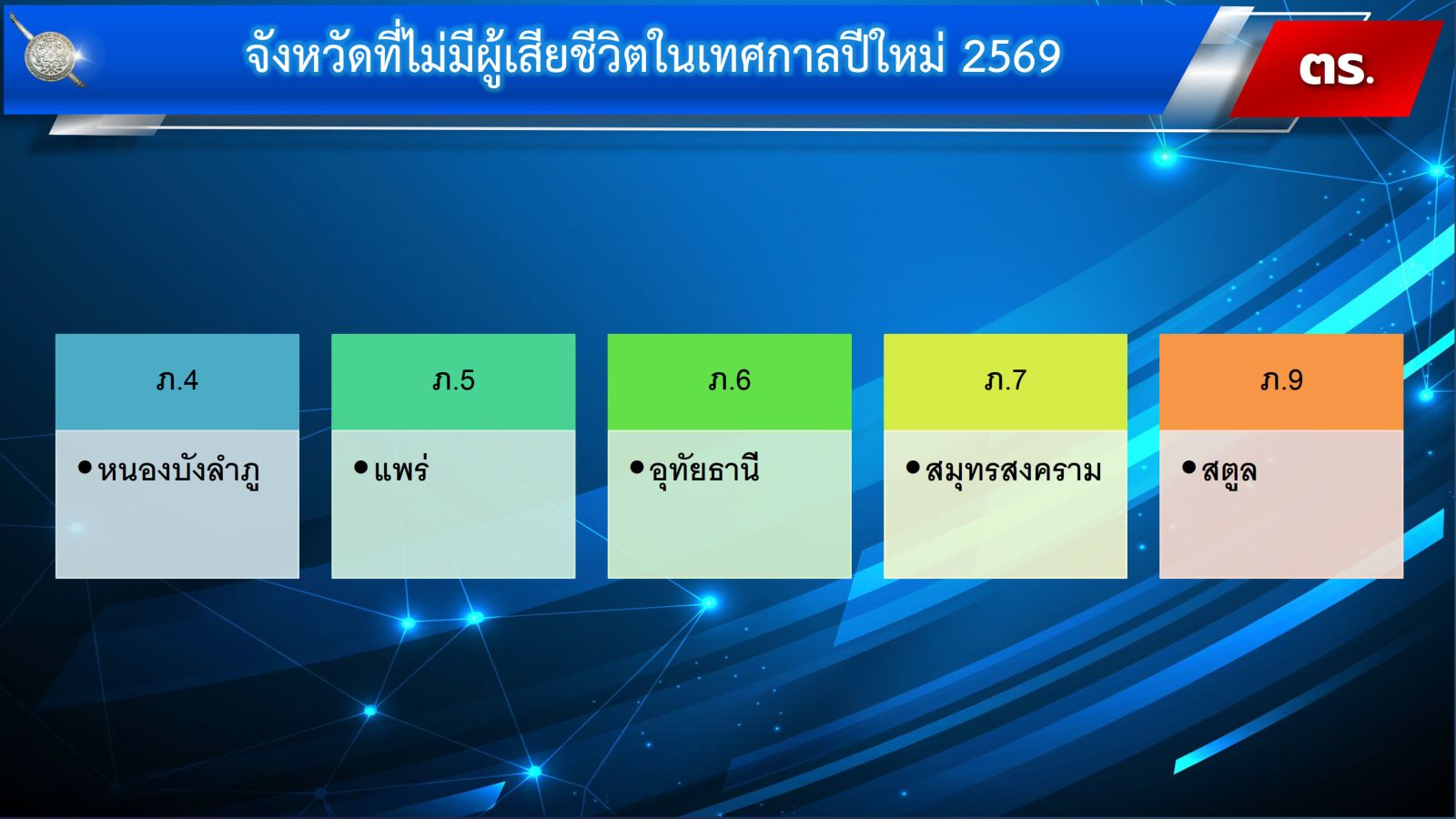 (6 มกราคม 2569) ศูนย์บริหารงานจราจร สำนักงานตำรวจแห่งชาติ (ศจร.ตร.) สรุปผลการดำเนินงานช่วงควบคุมเข้มข้น 7 วันอันตราย เทศกาลปีใหม่ พ.ศ.2569 ระหว่างวันที่ 30 ธันวาคม 2568 – 5 มกราคม 2569 พบว่า ภาพรวมสถานการณ์อุบัติเหตุทางถนนมีแนวโน้ม ลดลงอย่างชัดเจน ทั้งจำนวนอุบัติเหตุ ผู้บาดเจ็บ และผู้เสียชีวิต เมื่อเทียบกับช่วงเดียวกันของเทศกาลปีใหม่ พ.ศ.2568 สะท้อนถึงประสิทธิภาพของมาตรการด้านความปลอดภัยทางถนนและความร่วมมือของประชาชนในการปฏิบัติตามกฎจราจร