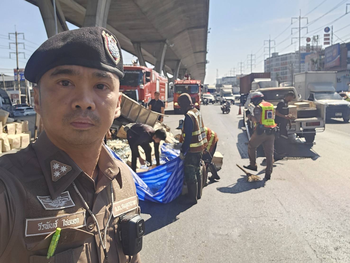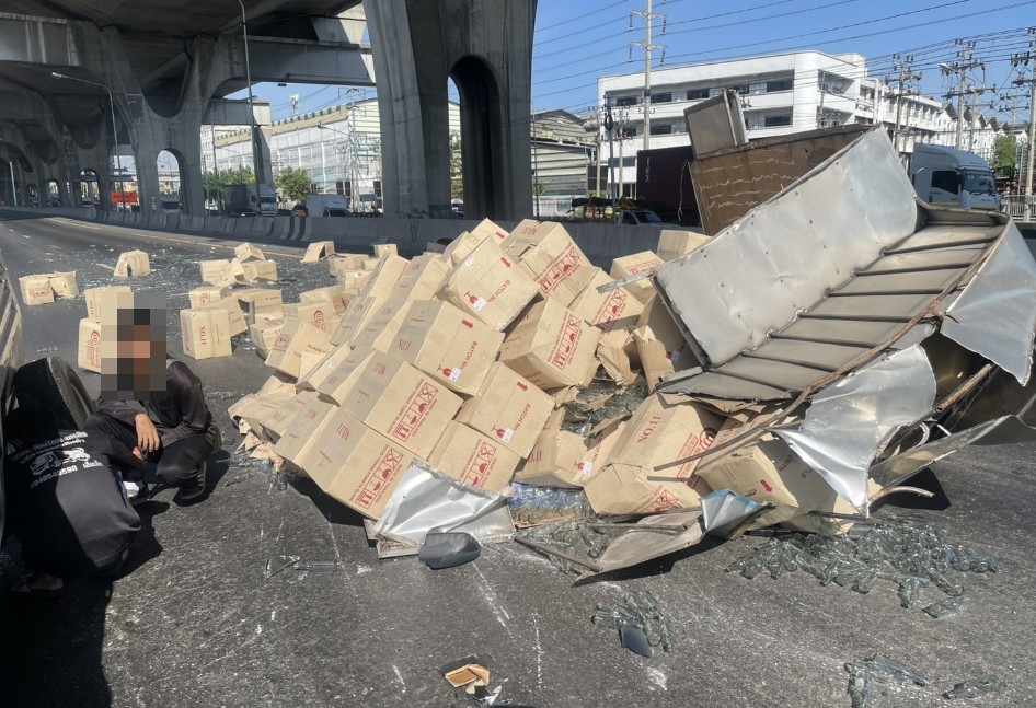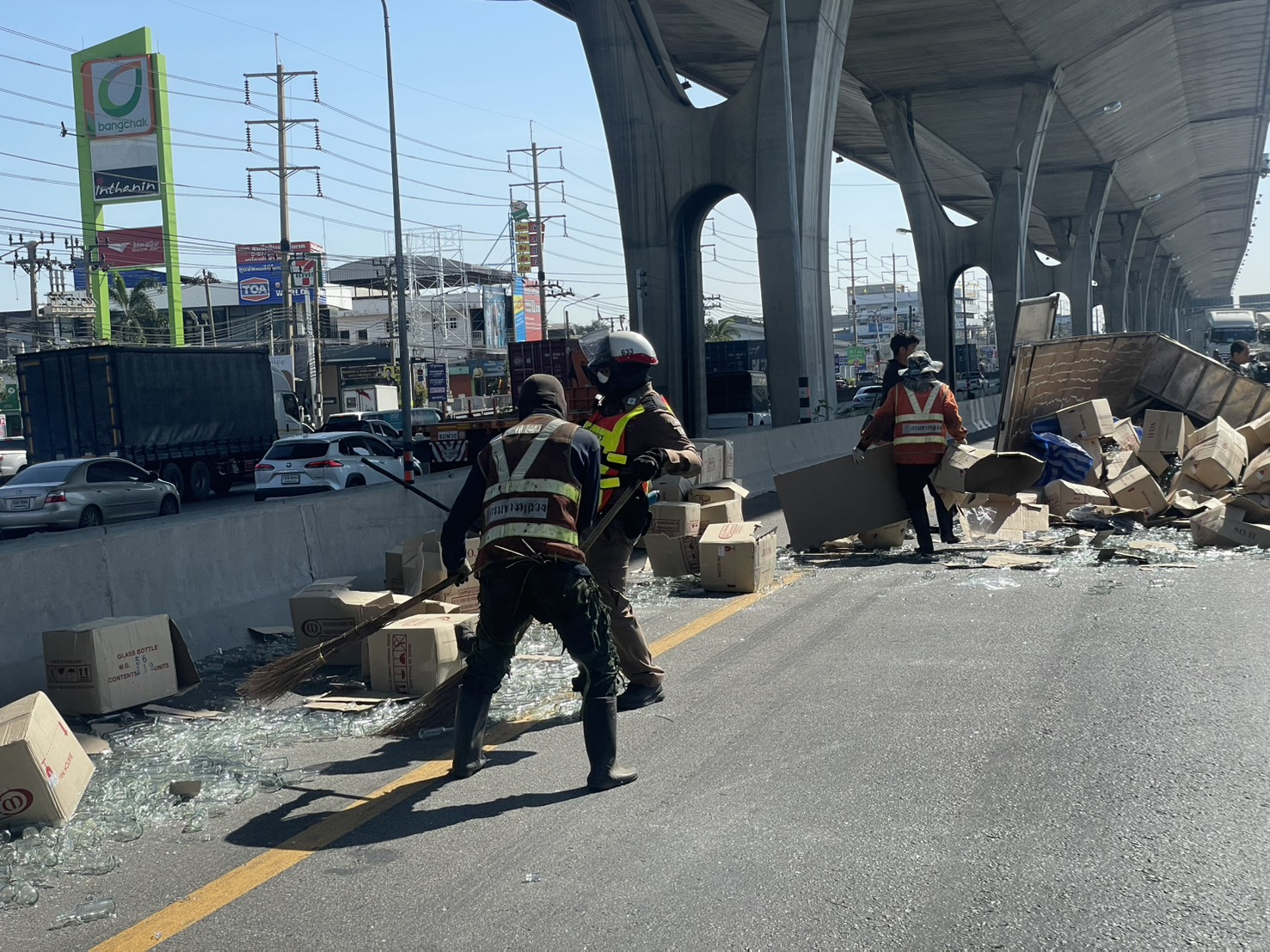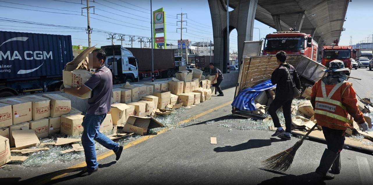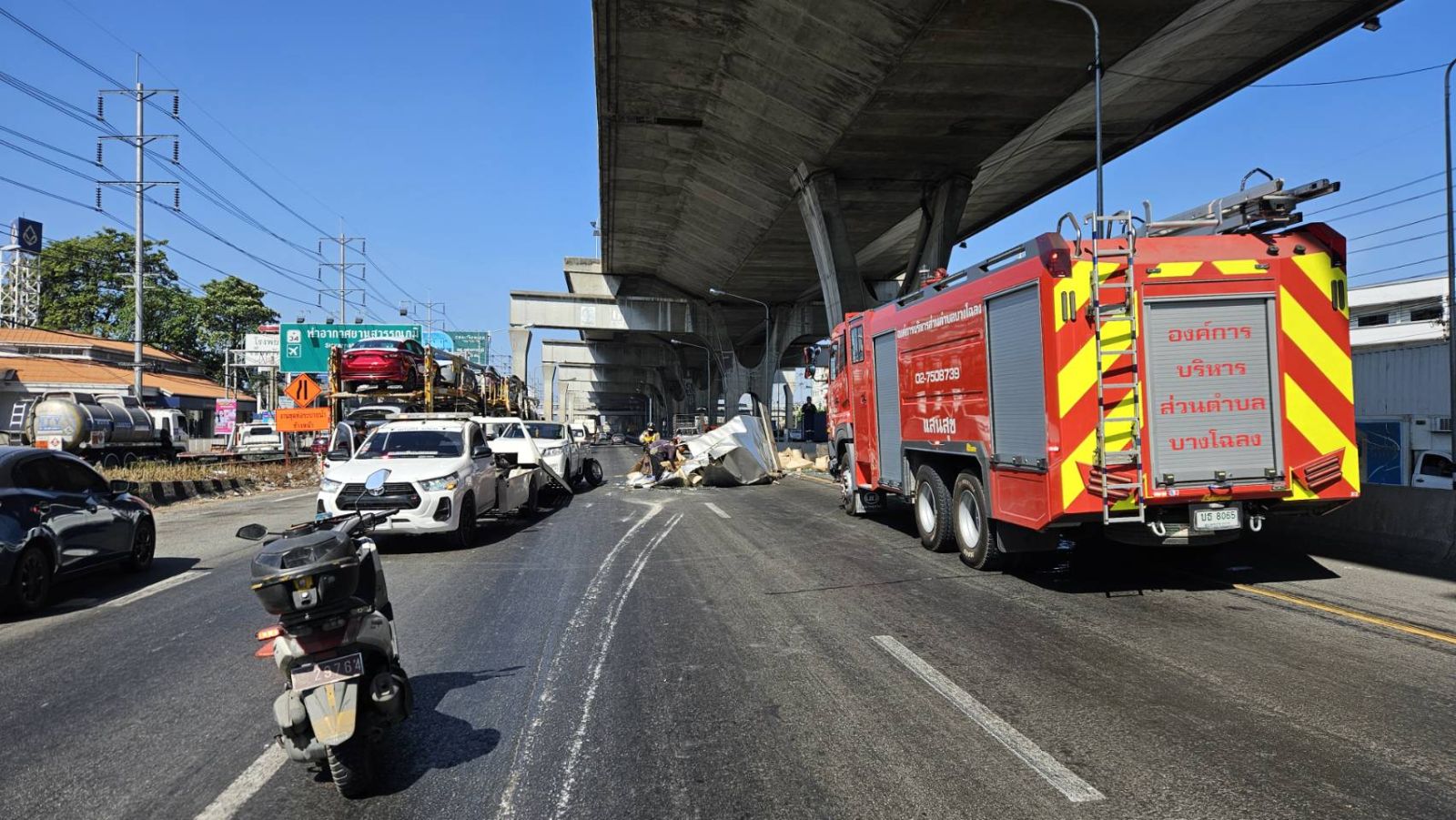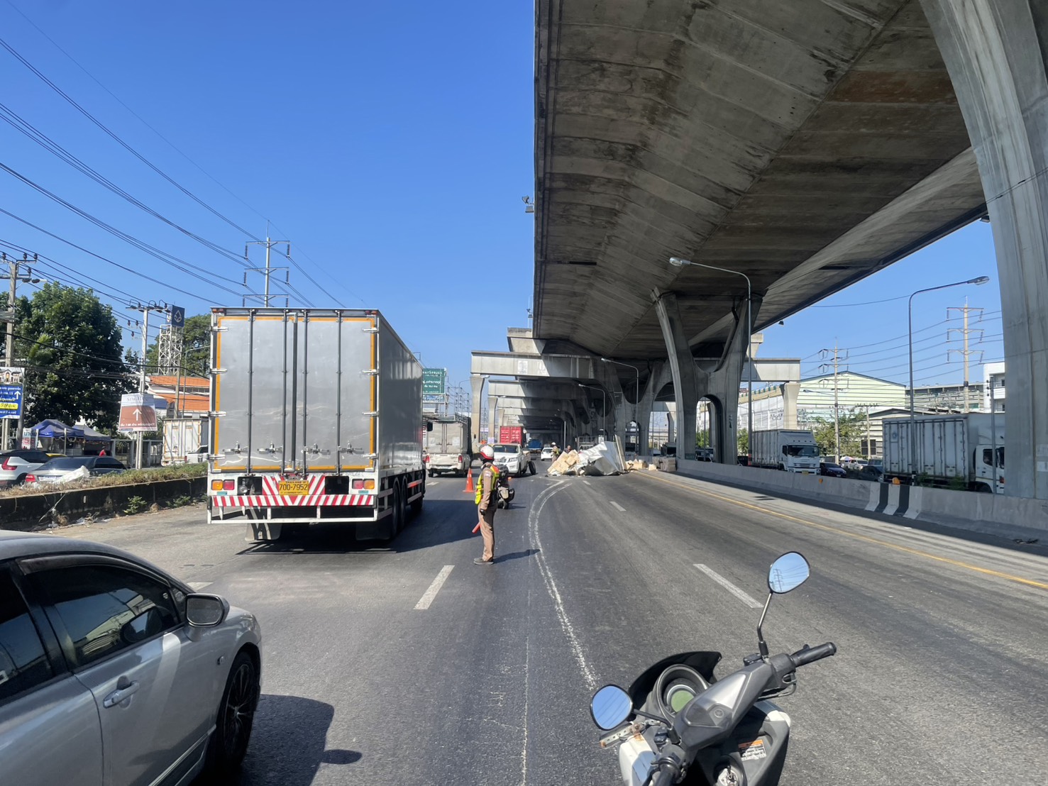 วันพฤหัสบดีที่ 8 มกราคม 2569 เวลาประมาณ 09.50 น. ทล.34 (ถนนเทพรัตน) ช่วง กม.16 ขาเข้า กรุงเทพ บริเวณบ้านกรองน้ำ (บางโฉลง) ช่องทางหลัก รถกระบะตู้ทึบเพลาขาด พลิกคว่ำ หลังคาหลุด มีแก้วตกหล่นเกลื่อนถนน กีดขวางการจราจร 2 ช่องทาง การจราจรหนาแน่น แนะใช้ช่องทางคู่ขนาน เจ้าหน้าที่แขวงการทาง และตำรวจกำลังอำนวยการจราจร ตอนนี้ท้ายแถวขาเข้าสะสม กม.ที่ 23 แล้ว