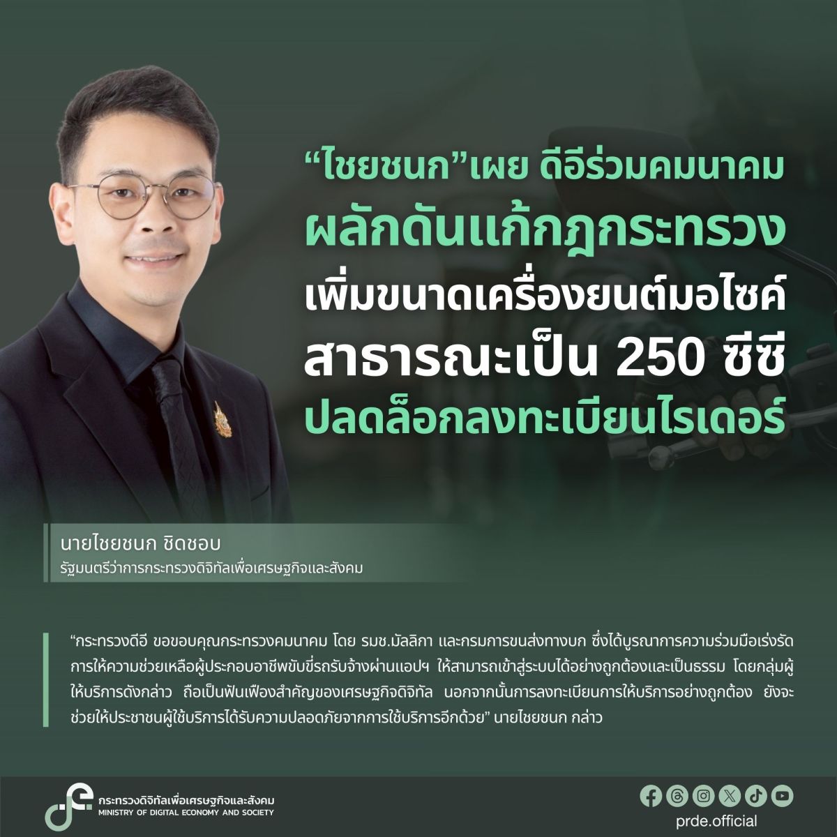 วันที่ 7 มกราคม 2569 นายไชยชนก ชิดชอบ รัฐมนตรีว่าการกระทรวงดิจิทัลเพื่อเศรษฐกิจและสังคม (ดีอี) เปิดเผยว่า ตามที่กระทรวงดีอี โดยสำนักงานพัฒนาธุรกรรมทางอิเล็กทรอนิกส์ (สพธอ.) หรือ ETDA ได้ร่วมกับนางสาวมัลลิกา จิระพันธุ์วาณิช รัฐมนตรีช่วยว่าการกระทรวงคมนาคม โดยกรมการขนส่งทางบก ผลักดันมาตรการช่วยเหลือไรเดอร์และไดรเวอร์ทั่วประเทศ เพื่อแก้ไขผลกระทบจากการนำรถยนต์หรือรถจักรยานยนต์ไปจดทะเบียนเป็น รถรับจ้างสาธารณะ รย.17 (รถจักรยานยนต์) หรือ รย.18 (รถยนต์) ในการให้บริการผ่านแอปพลิเคชัน