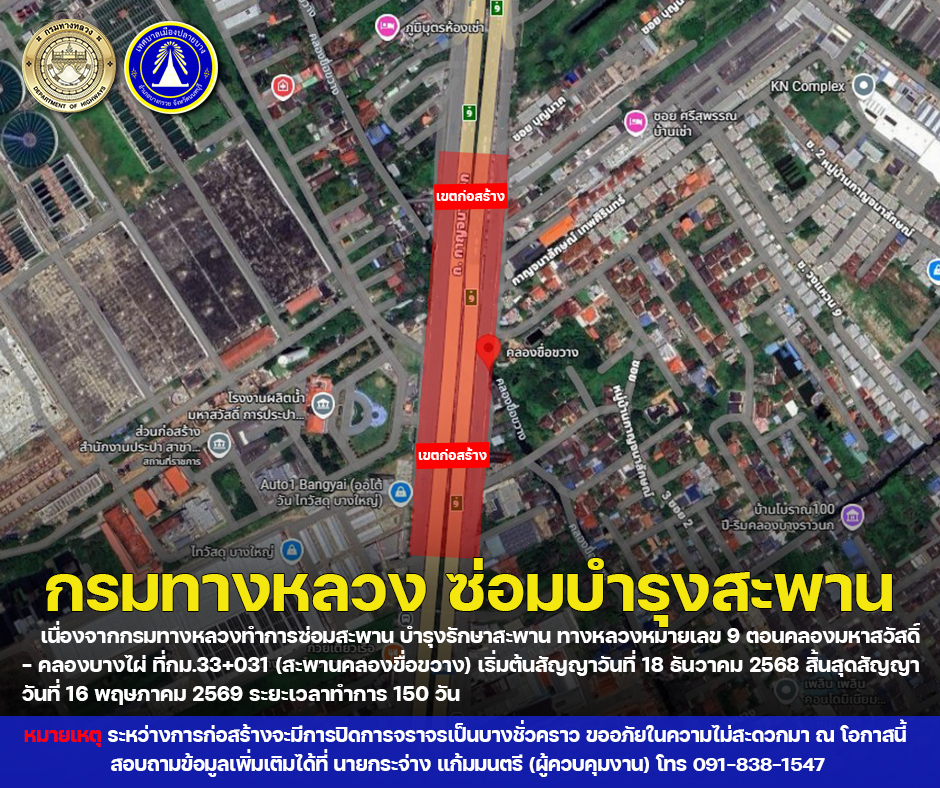 เริ่มสัญญาวันที่ 23 ธันวาคม 2568 สิ้นสุดสัญญาวันที่ 21 เมษายน 2569 ระยะเวลาทำการ 120 วัน จึงขอประชาสัมพันธ์ไปยังผู้ใช้รถใช้ถนน ระหว่างการก่อสร้างจะมีการปิดการจราจรเป็นบางช่วงชั่วคราว อาจเกิดความไม่สะดวกต่อผู้ใช้ทาง ขออภัยในความไม่สะดวกมา ณ โอกาสนี้