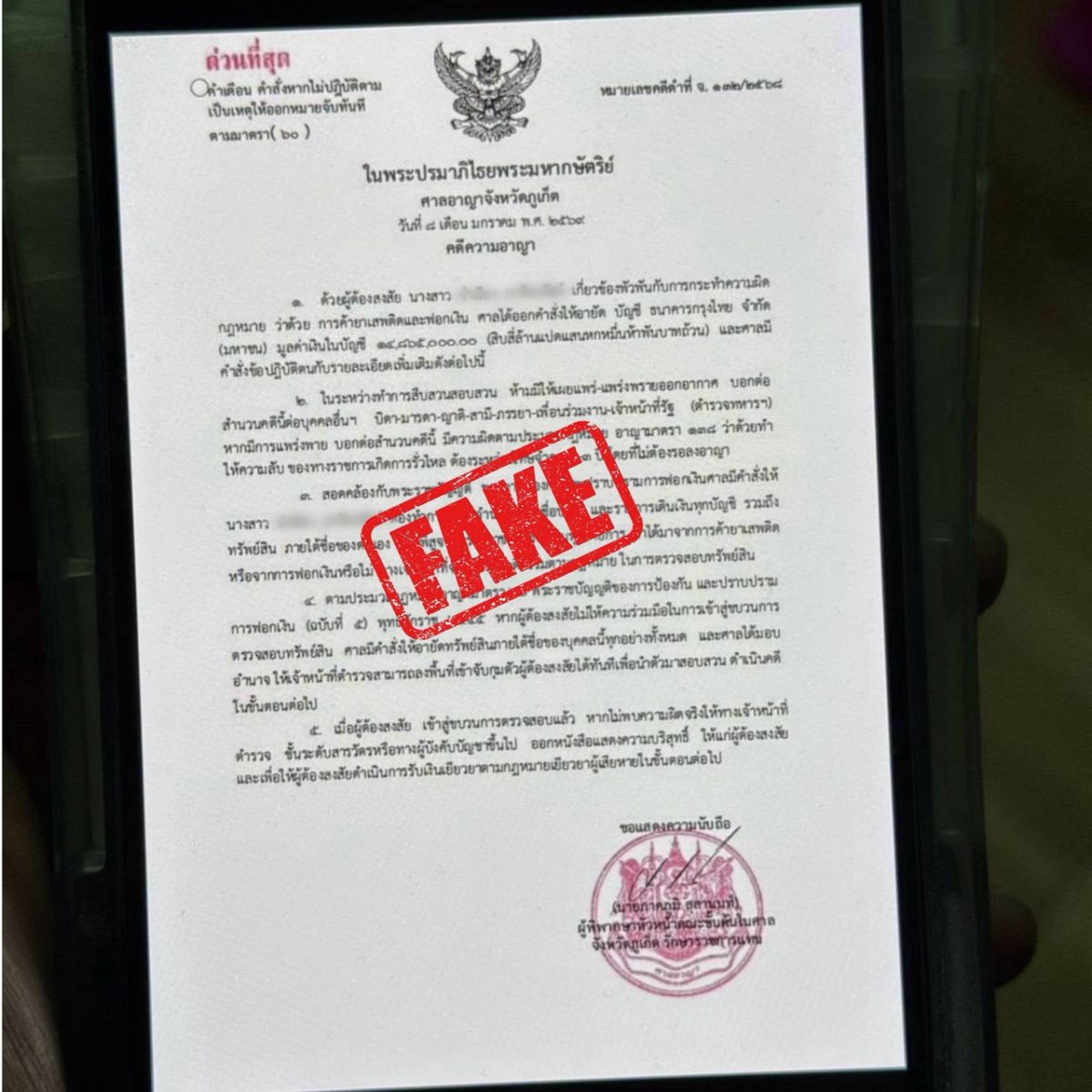 สอบถามผู้เสียหายภายหลังให้การว่า ได้รับโทรศัพท์จากบุคคลอ้างเป็นเจ้าหน้าที่ธนาคาร แจ้งว่าบัญชีของตนกำลังจะถูกอายัด ก่อนโอนสายไปยังบุคคลที่อ้างว่าเป็นเจ้าหน้าที่ตำรวจ สภ.เมืองภูเก็ต และให้โอนเงินไปยังปปง. เพื่อตรวจสอบ โดยคนร้ายใช้วิธีวิดีโอคอลสั่งการให้ทำตามขั้นตอนต่างๆ สุดท้ายผู้เสียหายหลงเชื่อและโอนเงินไปยังบัญชีคนร้ายรวม 5 ครั้ง เป็นเงินทั้งสิ้น 1,199,998 บาท