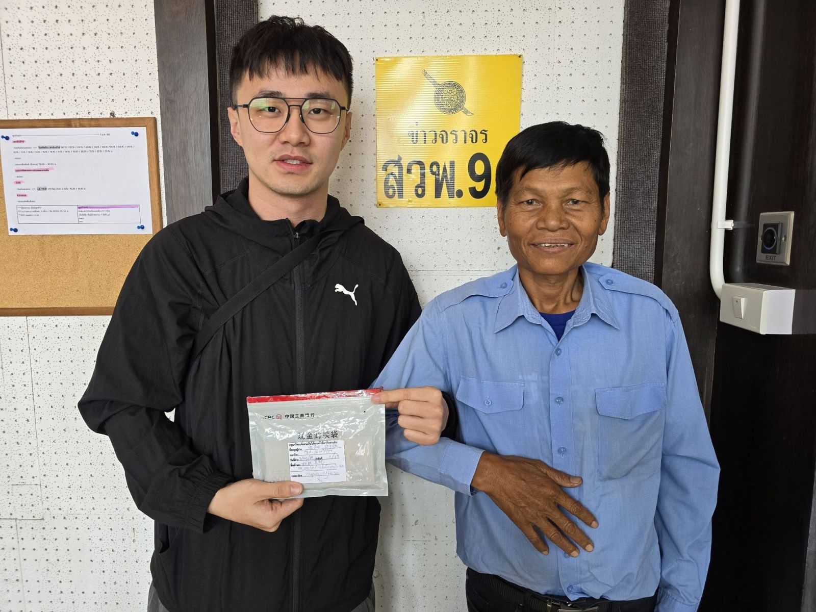 มีคุณไพศาล ดิษฐ์สอน เจ้าหน้าที่มหาวิทยาลัยเทคโนโลยีราชมงคลธัญบุรี โทรเข้ามา ที่ สวพ.FM91 แจ้งว่า ซองพลาสติก ที่คุณประสิทธิ์ เก็บได้ เป็นของ นักศึกษาชาวจีน โทรสอบถามคนขับแล้ว (มีเบอร์จากแอปครั้งแรก ที่เรียกรถ) แจ้งว่านำเข้ามาส่งคืนไว้ที่ สวพ.91 จึงโทรมาสอบถาม และนัดส่งคืนกัน