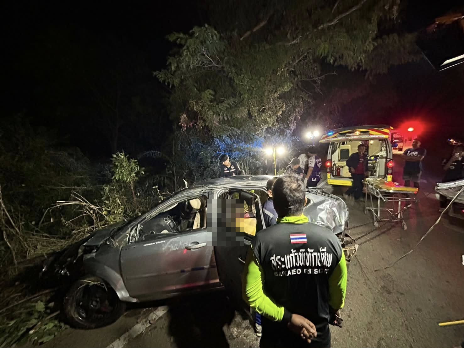 รถเก๋งเสียหลักพุ่งลงคลองน้ำข้างทาง พบร่างผู้เสียชีวิตหญิง 1 รายติดค้างภายในยานพาหนะ จ.สระแก้ว