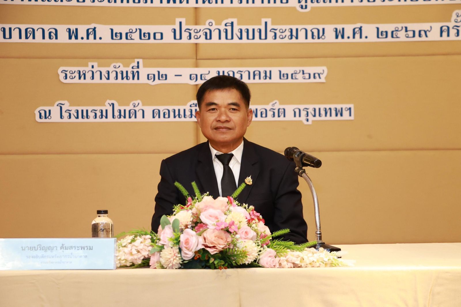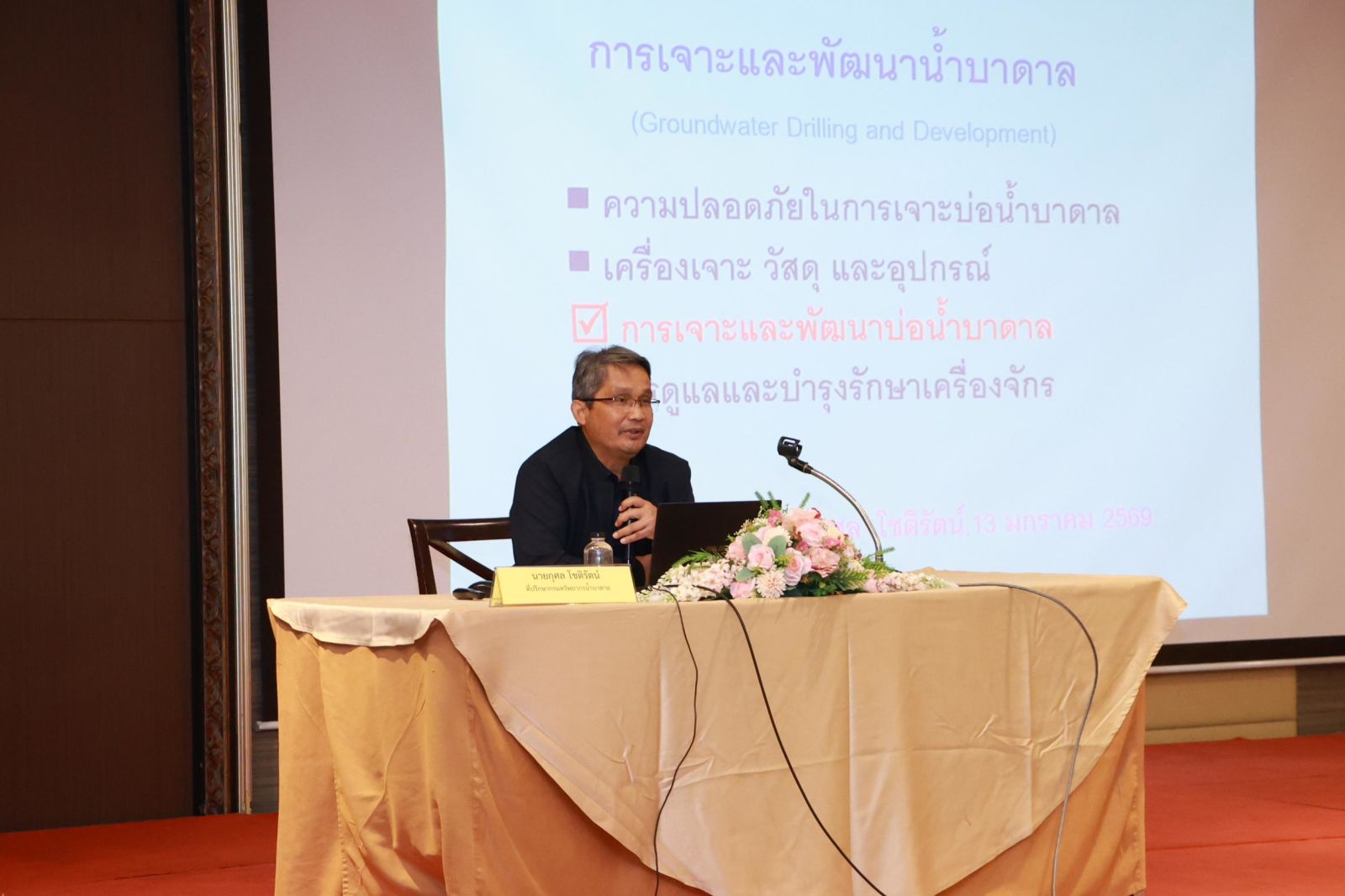 วันที่ 13 มกราคม 2569 นายภาดล ถาวรกฤชรัตน์ อธิบดีกรมทรัพยากรน้ำบาดาล มอบหมายให้นายปริญญา คุ้มสระพรม รองอธิบดีกรมทรัพยากรน้ำบาดาล เป็นประธานเปิดการฝึกอบรม หลักสูตร “การประกอบกิจการน้ำบาดาล ตามพระราชบัญญัติน้ำบาดาล พ.ศ. 2520 และที่แก้ไขเพิ่มเติม สำหรับผู้ปฏิบัติงานด้านการประกอบกิจการน้ำบาดาล” ครั้งที่ 1/2569 ภายใต้โครงการเสริมสร้างศักยภาพและประสิทธิภาพด้านการกำกับ ดูแลการประกอบกิจการน้ำบาดาล ตามพระราชบัญญัติน้ำบาดาล พ.ศ. 2520 ประจำปีงบประมาณ พ.ศ. 2569 ซึ่งได้รับงบประมาณสนับสนุนจากกองทุนพัฒนาน้ำบาดาล โดยนายสุชาติ ชินวรรณโชติ ผู้อำนวยการส่วนแผนงานและประเมินผล สำนักควบคุมกิจการน้ำบาดาล กล่าวรายงาน ซึ่งมีที่ปรึกษากรมทรัพยากรน้ำบาดาล ข้าราชการกรมทรัพยากรน้ำบาดาลจากส่วนกลางและส่วนภูมิภาค และเจ้าหน้าที่จากสำนักงานทรัพยากรธรรมชาติและสิ่งแวดล้อม 76 จังหวัด เข้ารับการฝึกอบรมจำนวนทั้งสิ้น 130 ราย จัดขึ้นระหว่างวันที่ 12 – 14 มกราคม 2569 ณ โรงแรมไมด้า ดอนเมือง แอร์พอร์ต กรุงเทพฯ