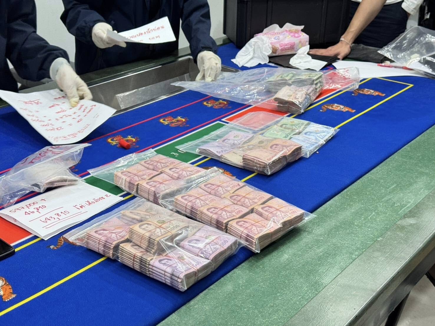 - ยึดเงินของกลางได้ เป็นเงินสดประมาณ 833,560 บาท ชิปแทนเงินสด 400,000 บาท รวมเป็นเงินประมาณ 1,233,560 บาท และพบหลักฐานทางบัญชียอดเงินเฉลี่ยวันละ 2 ล้านบาท (60 ล้านบาท/เดือน) และคาดว่ามีการคว้าเงินสดจำนวนหนึ่งหลบหนีไปด้วย