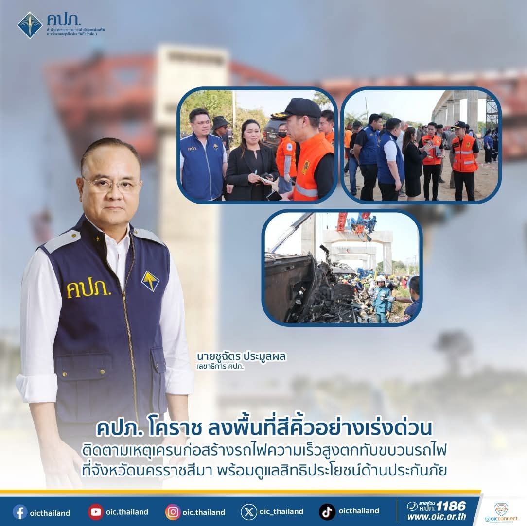จากกรณีเกิดเหตุรถไฟขบวนด่วนพิเศษ ขบวน 21 กรุงเทพฯ – อุบลราชธานี ประสบเหตุเครนที่ใช้ก่อสร้างทางรถไฟความเร็วสูงตกทับโบกี้รถไฟ เมื่อวันที่ 14 มกราคม 2569 เวลาประมาณ 09.30 น. จุดเกิดเหตุบริเวณช่วงกม.รถไฟที่ 220 หลัก 9 หมู่ที่ 11 บ้านถนนคต ตำบลสีคิ้ว อำเภอสีคิ้ว จังหวัดนครราชสีมา ส่งผลให้โบกี้รถไฟตกราง จำนวน 1 โบกี้ และเกิดไฟไหม้ จำนวน 1 โบกี้ เบื้องต้นพบผู้เสียชีวิต จำนวน 29 ราย และได้รับบาดเจ็บ จำนวน 67 ราย เพื่อให้การดูแลและคุ้มครองสิทธิประโยชน์ด้านการประกันภัยเป็นไปอย่างถูกต้อง ครบถ้วน รวดเร็ว และเป็นธรรม