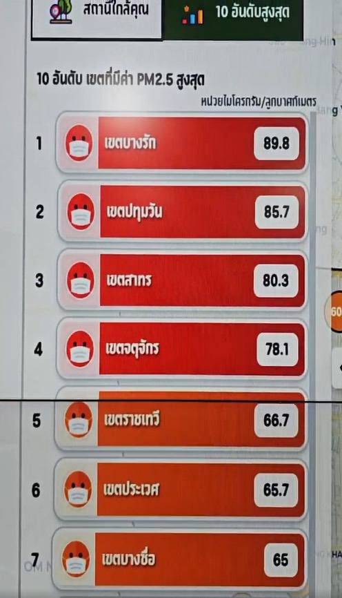 ผู้ว่าฯ ชัชชาติ กล่าวต่อว่า หากสังเกตสถานการณ์ฝุ่นปีนี้จะมีรูปแบบแตกต่างจากปีก่อน เนื่องจากปีก่อน กทม. มีค่าฝุ่นสูงในเขตด้านนอกฝั่งตะวันออก เช่น มีนบุรี หนองจอก ซึ่งส่วนหนึ่งน่าจะมาจากการเผา แต่ขณะนี้ค่าฝุ่นสีแดงอยู่ในเขตกรุงเทพฯ ชั้นใน คาดว่าน่าจะเป็นฝุ่นจากรถยนต์ โดยการก่อสร้างรถไฟฟ้าทำให้การจราจรติดขัด ส่งผลให้ค่าฝุ่นสูงขึ้นในช่วงเช้า เนื่องจากมีการสะสมของฝุ่นมากขึ้น