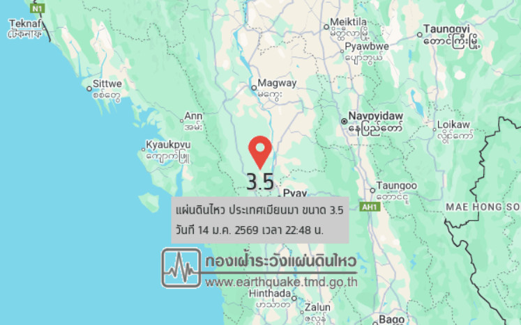 วันที่ 14 ม.ค. 2569 เวลา 22.48 น. กองเฝ้าระวังแผ่นดินไหว กรมอุตุนิยมวิทยา แจ้งเหตุแผ่นดินไหว ขนาด 3.5 ความลึก 10 กม. ภายในพื้นที่ของประเทศเมียนมา (19.17°N,95.02°E) ศูนย์กลางห่างออกไปทางทิศตะวันตกเฉียงเหนือของ อ.ขุนยวม จ.แม่ฮ่องสอน ประมาณ 309 กม. ยังไม่มีรายงานผลกระทบต่อประเทศไทย