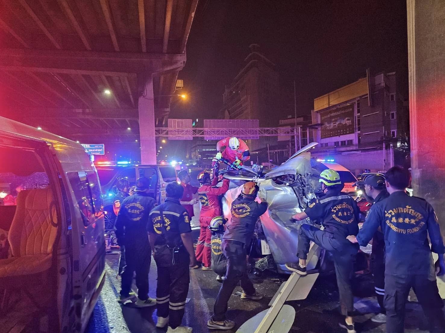 ที่เกิดเหตุ พบรถกระบะ ฟอร์ต สีขาว ลักษณะชนขอบทางกั้น ตรวจสอบพบว่ามีผู้ได้รับบาดเจ็บ 1 ราย ติดอยู่ภายในยานพาหนะ ทางอาสากู้ภัยร่วมดำเนินการใช้เครื่องมือตัดถ่างงัดรถ เพื่อนำผู้บาดเจ็บออกมา พื้นที่ สน.วิภาวดี