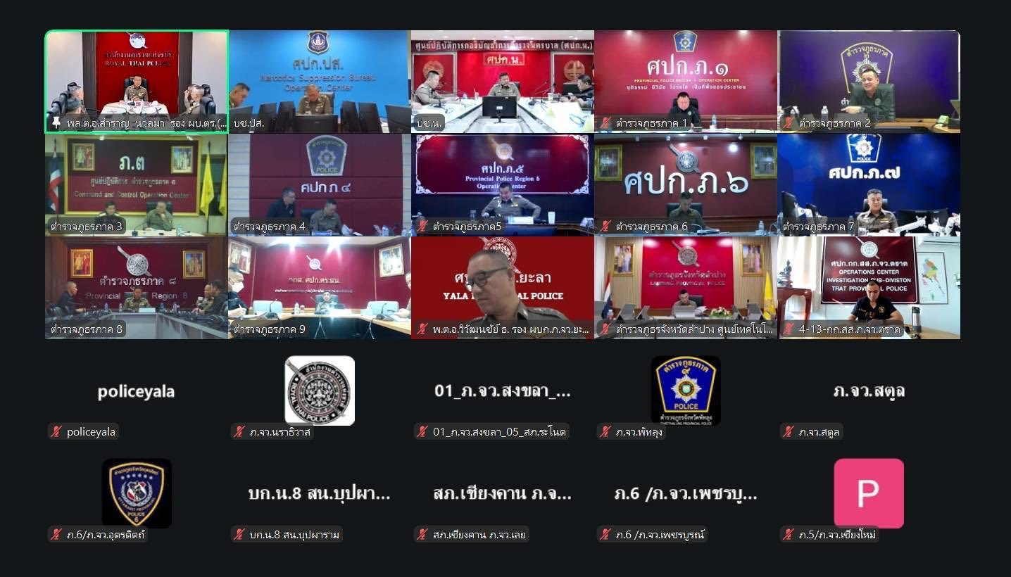 วันนี้ (14 มกราคม 2569) เวลา 08.30 น. พล.ต.อ.สำราญ นวลมา รอง ผบ.ตร./ผอ.ศอ.ปส.ตร. เป็นประธานการประชุมสรุปผลปฏิบัติการปิดล้อมตรวจค้นเครือข่ายยาเสพติดทั่วประเทศ ครั้งที่ 6/2569 โดยมี พล.ต.ท.สมประสงค์ เย็นท้วม ผู้ช่วย ผบ.ตร./รอง ผอ.ศอ.ปส.ตร., พล.ต.ท.อาชยน ไกรทอง ผู้บัญชาการตำรวจปราบปรามยาเสพติด, ผู้แทนกองบัญชาการตำรวจนครบาล, ตำรวจภูธรภาค 1-9 และหน่วยงานที่เกี่ยวข้อง เข้าร่วมประชุม ทั้งในที่ตั้งและผ่านระบบการประชุมทางไกล (Video Conference) ณ ห้องประชุม TOC ชั้น 20 อาคาร 1 สำนักงานตำรวจแห่งชาติ