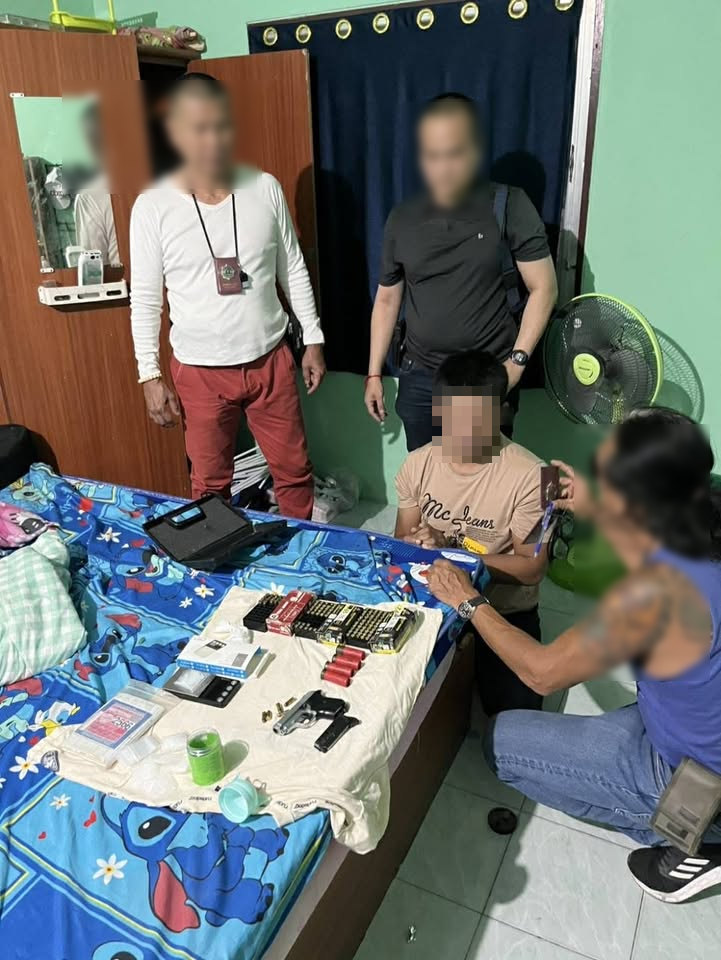 ผู้ต้องหารายแรก ชายไทย ถูกจับกุมในข้อหาครอบครองยาเสพติดให้โทษประเภท 1 (ไอซ์) เพื่อจำหน่ายและเสพ รวมถึงครอบครองอาวุธปืนและเครื่องกระสุนปืนโดยไม่ได้รับอนุญาต โดยตรวจยึดยาไอซ์น้ำหนักรวม 82.77 กรัม อาวุธปืนกึ่งอัตโนมัติขนาด .32 จำนวน 1 กระบอก พร้อมเครื่องกระสุนปืนหลายรายการ รวมทั้งกระสุนขนาด .32 จำนวน 88 นัด กระสุนขนาด 9 มม. จำนวน 17 นัด และกระสุนลูกซองเบอร์ 12 จำนวน 4 นัด