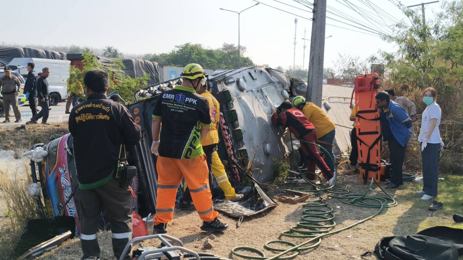 วันที่ 15 มกราคม 2568 เมื่อเวลา 08.30 น. ศูนย์วิทยุหน่วยกู้ภัยเพียวเยี้ยงไท้ศรีราชา รับแจ้งเหตุรถบัสรับส่งพนักงานโรงงานเสียหลักพลิกคว่ำ บริเวณหน้าปิ่นทอง3 ถ.331 ตัดใหม่ มุ่งหน้าแหลมฉบัง ม.4 ต.หนองขาม อ.ศรีราชา จ.ชลบุรี จึงรุดไปตรวจสอบพร้อมเจ้าหน้าที่ตำรวจ สภ.หนองขาม และหน่วยกู้ภัยเพียวเยี้ยงไท้ศรีราชา