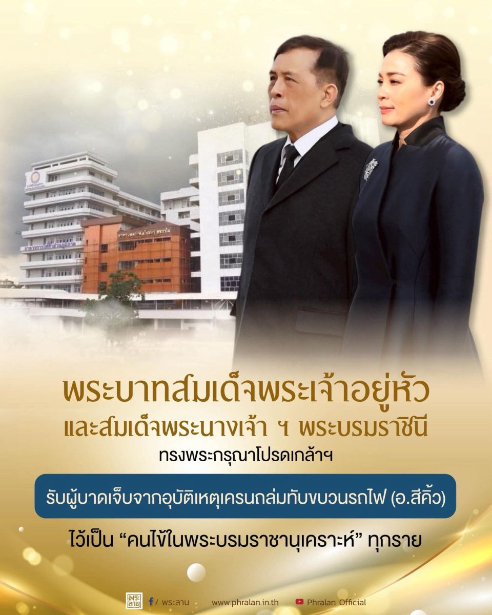 พระบาทสมเด็จพระเจ้าอยู่หัว และสมเด็จพระนางเจ้า ฯ พระบรมราชินี ทรงห่วงใยและทรงเสียพระราชหฤทัย ต่อเหตุการณ์เครนใช้ก่อสร้างทางรถไฟความเร็วสูง ถล่มทับรถไฟขบวนด่วนพิเศษ ขบวน ๒๑ กรุงเทพอภิวัฒน์ - อุบลราชธานี ที่ตำบลสีคิ้ว อำเภอสีคิ้ว จังหวัดนครราชสีมา ทำให้มีผู้บาดเจ็บและเสียชีวิตเป็นจำนวนมาก
