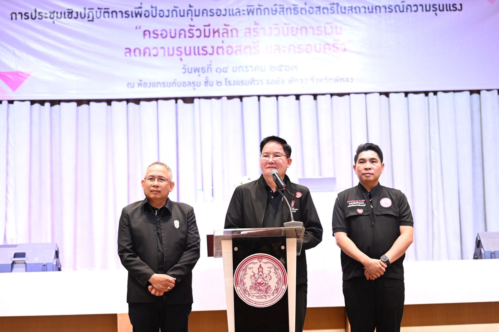 วันที่ 14 มกราคม 2569 นายอัครา พรหมเผ่า รัฐมนตรีว่าการกระทรวงการพัฒนาสังคมและความมั่นคงของมนุษย์ (รมว.พม.) ลงพื้นที่ ณ จังหวัดพัทลุง เพื่อเป็นประธานเปิดการประชุมเชิงปฏิบัติการเพื่อป้องกันคุ้มครองและพิทักษ์สิทธิต่อสตรีในสถานการณ์ความรุนแรง "ครอบครัวมีหลัก สร้างวินัยการเงิน ลดความรุนแรงต่อสตรีและครอบครัว" โดยมี นายกองตรี ดร.ธนกฤต จิตอารีย์รัตน์ เลขานุการรัฐมนตรีว่าการกระทรวงการพัฒนาสังคมและความมั่นคงของมนุษย์ , นายกันตพงศ์ รังษีสว่าง ปลัดกระทรวงการพัฒนาสังคมและความมั่นคงของมนุษย์ , นางจตุพร โรจนพานิช อธิบดีกรมกิจการสตรีและสถาบันครอบครัว , คณะผู้บริหารกระทรวง พม. , นางสาวศรอนงค์ สงสมพันธ์ รองผู้ว่าราชการจังหวัดพัทลุง , ดร.สุพัชรี ธรรมเพชร ประธานคณะกรรมการพัฒนาสตรีจังหวัดพัทลุง , หัวหน้าหน่วยงาน พร้อมเจ้าหน้าที่ทีม พม.ใกล้คุณ จังหวัดพัทลุงและสงขลา และผู้แทนเครือข่ายที่เกี่ยวข้องในพื้นที่ เข้าร่วม ณ โรงแรมศิวา รอยัล อำเภอเมือง จังหวัดพัทลุง