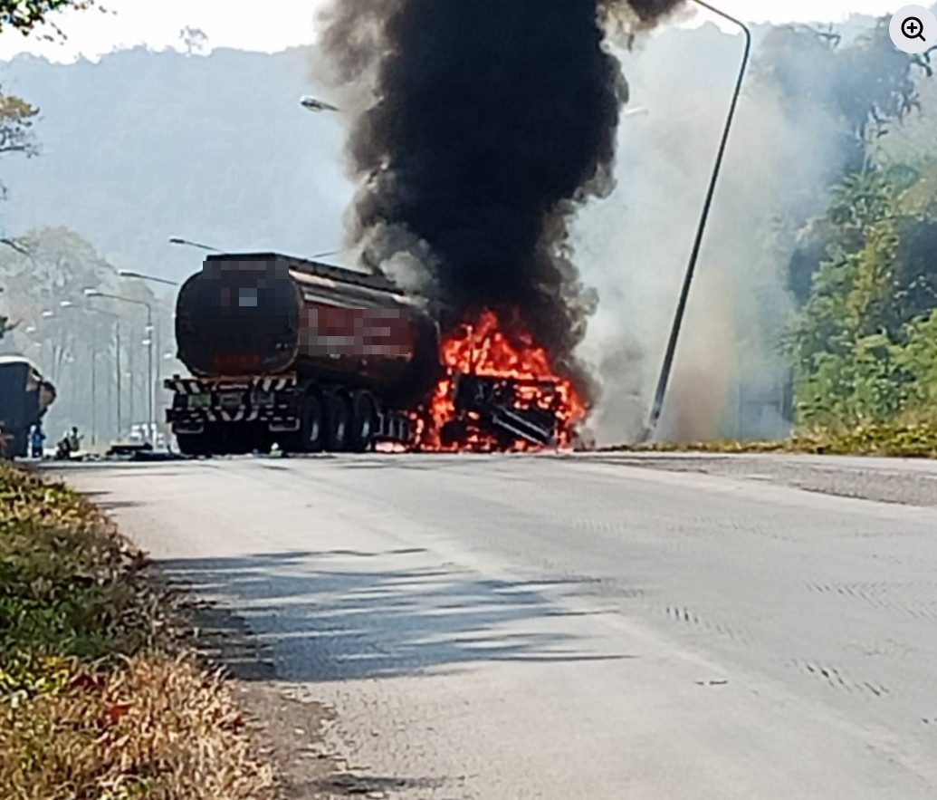 เกิดอุบัติเหตุ รถบรรทุกน้ำมัน (รถเปล่า) ชนกับรถเทรลเลอร์บรรทุกกระดาษ ส่งผลให้รถบรรทุกน้ำมันเกิดเพลิงไหม้ กีดขวางช่องทางจราจร