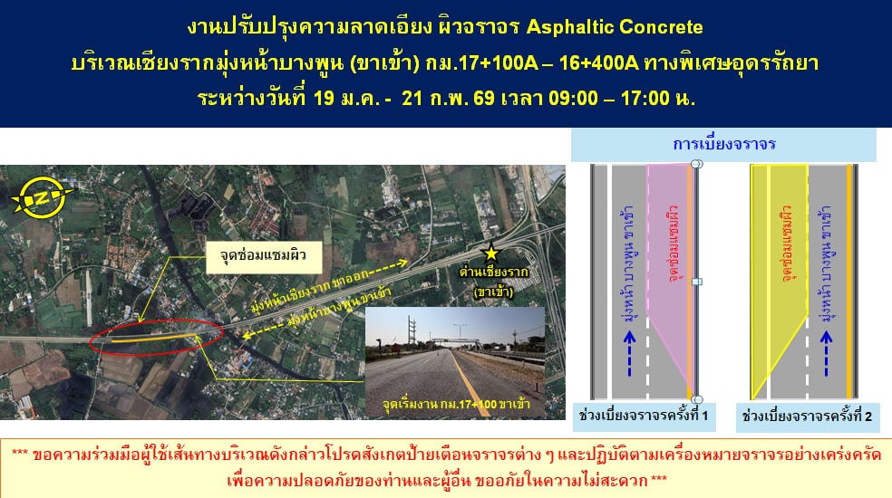บริษัท ทางด่วนและรถไฟฟ้ากรุงเทพ จำกัด (มหาชน) หรือ BEM ประชาสัมพันธ์แจ้งเบี่ยงการจราจร บริเวณเชียงรากมุ่งหน้าบางพูน ทางพิเศษอุดรรัถยา เนื่องจากมีความจำเป็นต้องปรับปรุงความลาดเอียงของผิวจราจร เพื่อความปลอดภัยของผู้ใช้ทาง โดยผู้ใช้ทางยังสามารถสัญจรได้ตามปกติ
