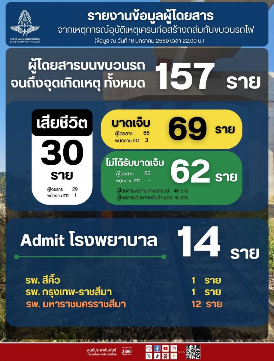 อุบัติเหตุจากกรณีดังกล่าวสามารถสรุปตัวเลขผู้โดยสารที่อยู่บนขบวนรถ ณ จุดเกิดเหตุ เมื่อวันที่ 14 มกราคม 2569 จำนวน 157 คน รถไฟคันที่ 1 จำนวน 54 คน คันที่ 2 จำนวน 53 คน และคันที่ 3 จำนวน 45 คน มีผู้เสียชีวิตทั้งสิ้น 30 ราย เป็นผู้โดยสารรถไฟ 29 ราย พนักงานบริษัท อิตาเลี่ยนไทย จำกัด 1 ราย สามารถยืนยันตัวตนได้แล้ว 29 ราย ส่วนผู้บาดเจ็บมีจำนวน 66 ราย แพทย์อนุญาตให้เดินทางกลับบ้านได้ จำนวน 52 ราย เหลือพักรักษาตัวอยู่โรงพยาบาลอีก 14 ราย