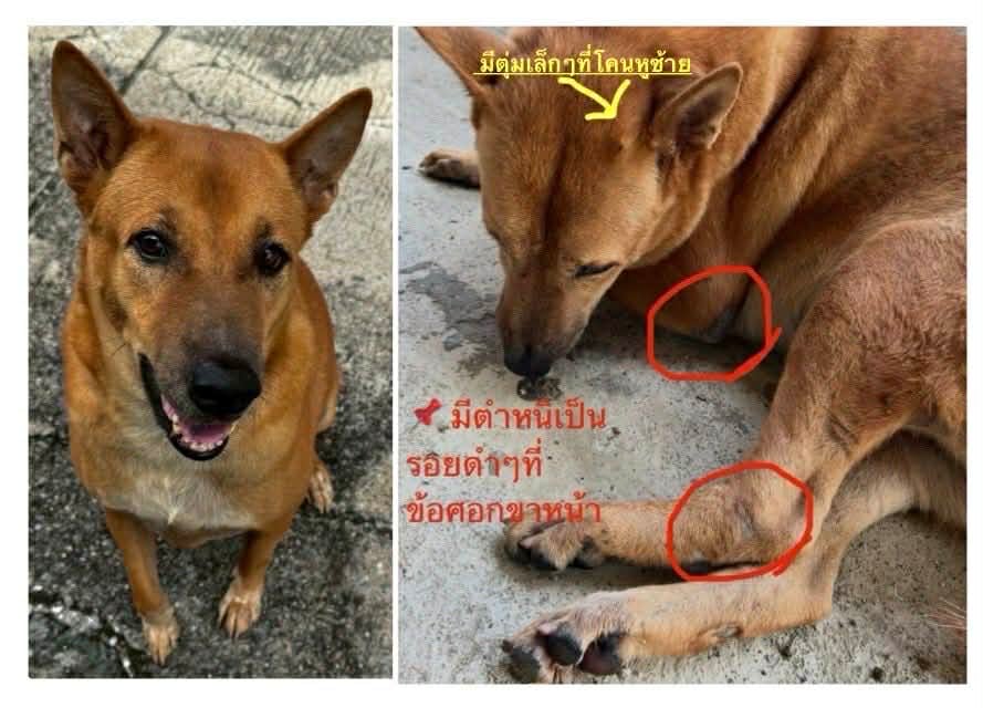 สุนัขพันธุ์ไทย ชื่อ "ขมิ้น" อายุ 8 ปี สุนัขหน้าโหดแต่เชื่อง ขนสีน้ำตาล ตัวใหญ่ หูตั้ง หางตรง ขนสั้น ไม่ได้สวมปลอกคอ
