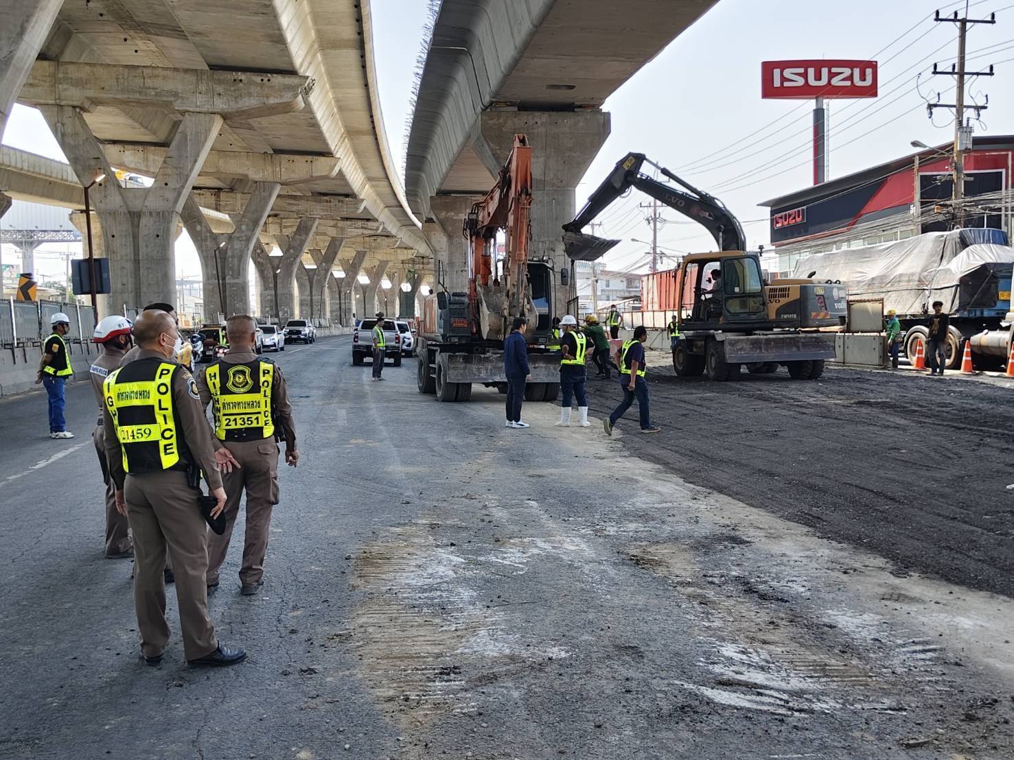 ทั้งนี้ เจ้าหน้าที่ตำรวจจราจรในพื้นที่ร่วมกับตำรวจทางหลวง ได้เร่งจัดทำทางเบี่ยงและบริหารจัดการจราจรอย่างเป็นระบบ ได้ดำเนินการปิดและเปิดช่องทางจราจรตามจุดที่ได้รับผลกระทบอย่างเหมาะสม ทั้งขาเข้าและขาออก เพื่อหลีกเลี่ยงบริเวณที่เกิดเหตุถนนทรุดตัวและจุดเครนถล่ม พร้อมเปิดช่องทางเบี่ยงจากทางคู่ขนานเข้าสู่ช่องทางหลักในบางช่วง เพื่อหลีกเลี่ยงจุดเสี่ยง พร้อมจัดกำลังอำนวยความสะดวกและเร่งระบายรถอย่างต่อเนื่อง พร้อมประชาสัมพันธ์ข้อมูลเส้นทางให้ประชาชนรับทราบอย่างต่อเนื่องตลอดทั้งวัน ส่งผลให้การจราจรแม้มีปริมาณรถหนาแน่น แต่ยังสามารถเคลื่อนตัวได้