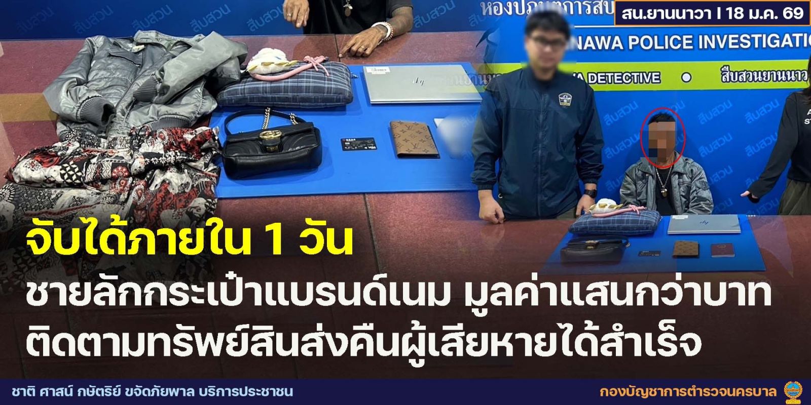 วันที่ 17 ม.ค. 69 เวลาประมาณ 00.13 น. ภายใต้การอำนวยการของ พ.ต.อ.พันษา อมราพิทักษ์ ผกก.สน.ยานนาวา นำโดย พ.ต.ท.อาทิตย์ ชาตินักรบ รอง ผกก.สส.สน.ยานนาวา พร้อมเจ้าหน้าที่ตำรวจฝ่ายสืบสวน สน.ยานนาวา ทำการจับกุมผู้ต้องหา นายยะ (นามสมมติ) อายุ 45 ปี ข้อหา “ลักทรัพย์ในเวลากลางคืนหรือรับของโจร” พร้อมด้วยของกลาง คอมพิวเตอร์โน๊ตบุ๊ค ยี่ห้อ HP สีเทาเงิน มูลค่าประมาณ 25,000 บาท , กระเป๋ายี่ห้อ Gucci ,กระเป๋าสะตางค์ ยี่ห้อ LV สีน้ำตาล รวมของกลาง มูลค่า 155,000฿
